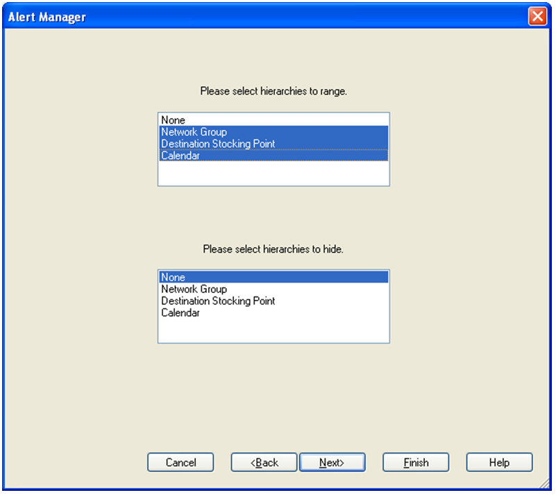 Select hierarchies for the new workbook and click Next. In most cases, both product and location hierarchies should be selected. In this case, since we are reviewing a Network Alert, we select the Network Group, Destination Stocking Point, and Calendar hierarchies. At this time, the wizard for the workbook template that was selected is displayed. The Alert Manager - Available Destination Stocking Points Window appears.