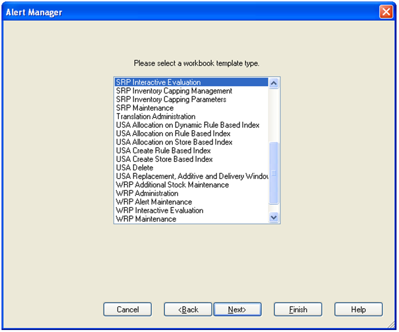 Select the workbook template that you want to use to build the workbook, and click Next. Typically, the SRP Interactive Evaluation workbook is selected. The Alert Manager- Select Hierarchies Window opens.