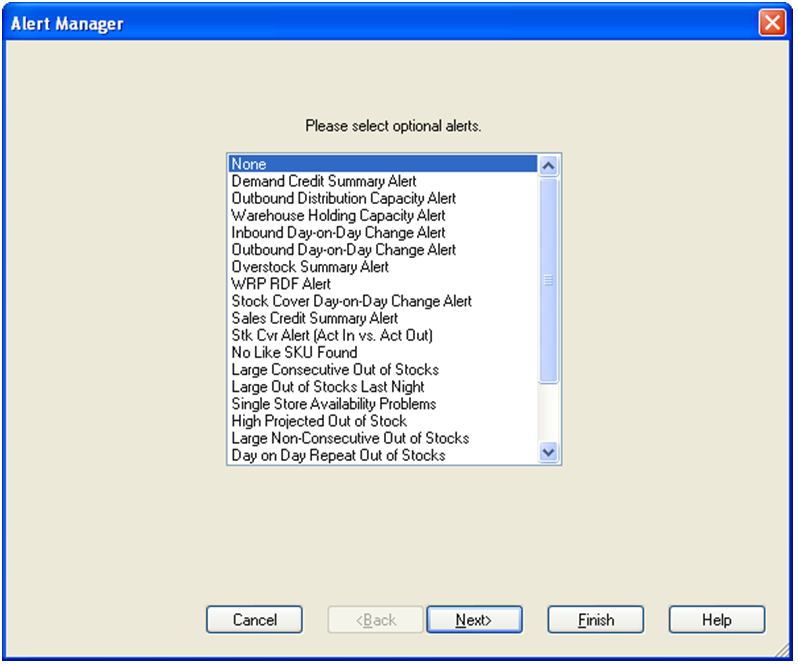 Select hierarchies for the new workbook and click Next. In most cases, both product and location hierarchies should be selected. At this time, the wizard for the workbook template that was selected is displayed. The Alert Manager - Available SKUs Window opens.
