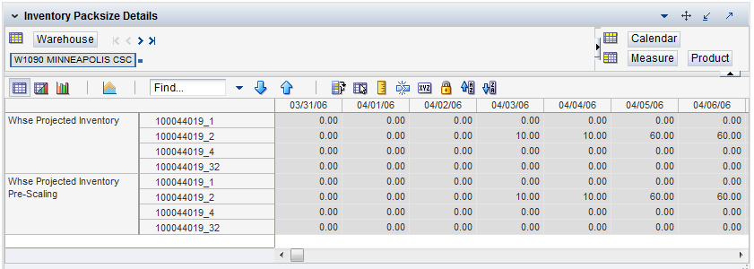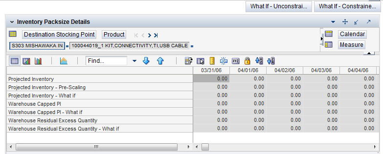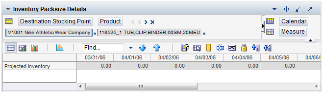 A read-only summation in units of the projected opening inventory position for any day in the planning horizon at a specific warehouse. None of that day's activities (either receipts or demand) are reflected in PI, and so it is often referred to as a beginning of day position. This measure has a related filtered worksheet. See the Inventory Packsize Details View for more information. |