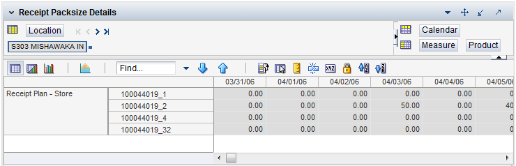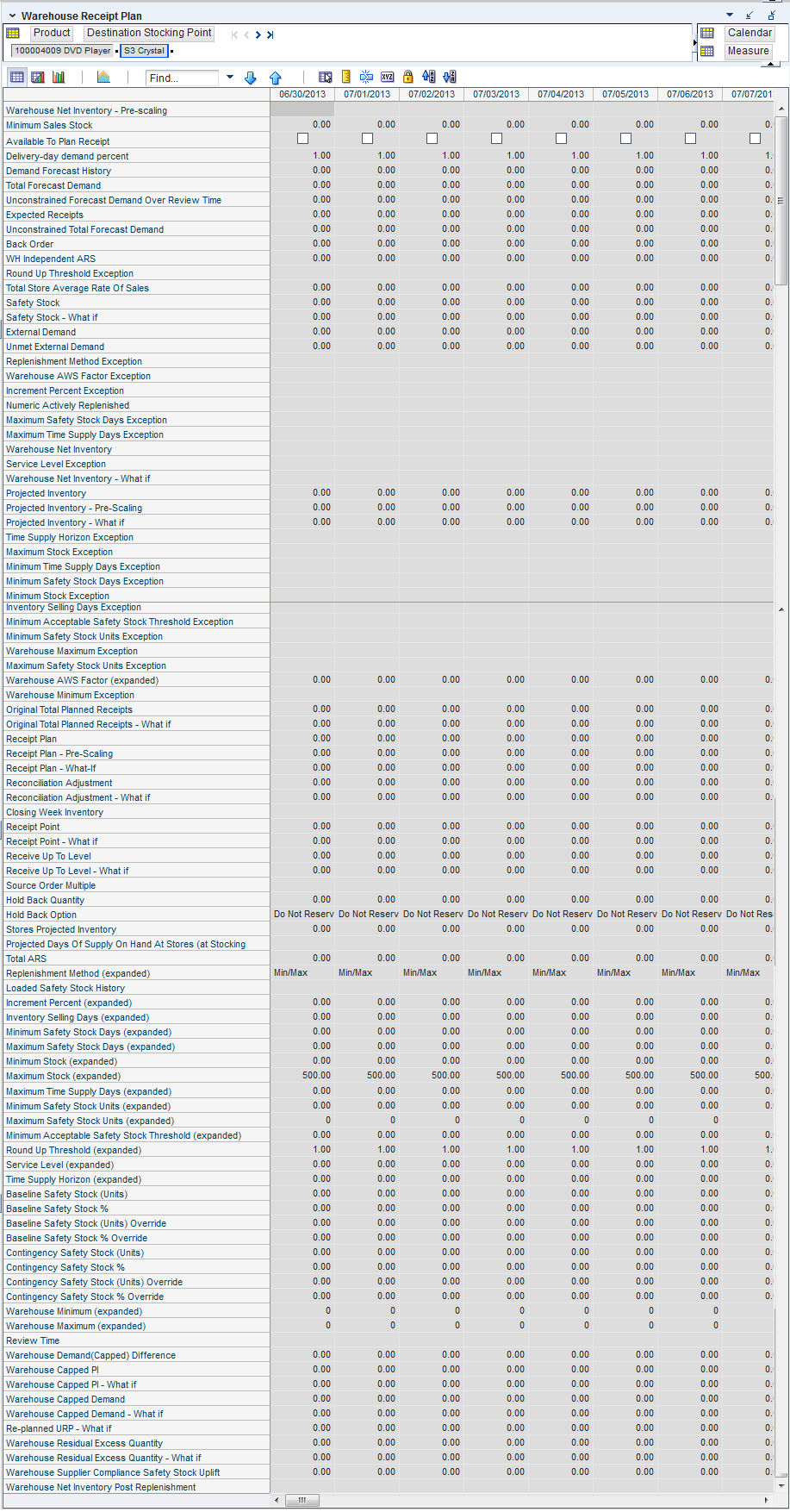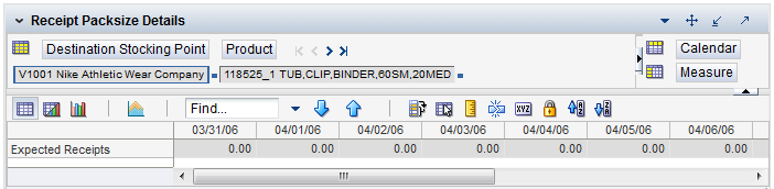 Those orders (Purchase Orders or Transfers) that have already been executed and therefore need to be considered when planning future orders for a destination. Expected Receipts is the sum of in-transits and on orders. This measure has a related filtered worksheet. See the Receipt Packsize Details View for more information. |