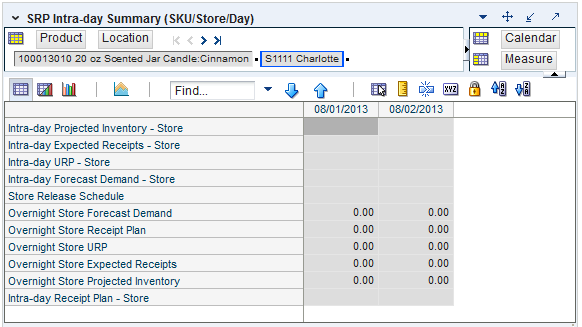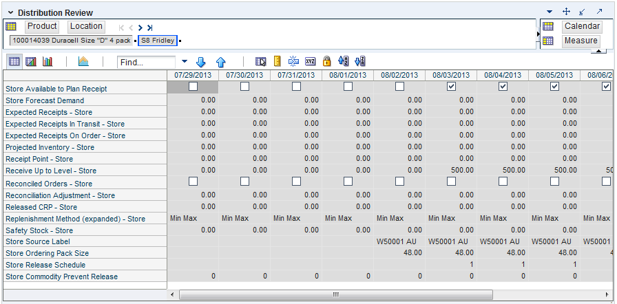 This step contains views that allow you to examine the store replenishment plan sales, orders, and inventory. The available views are: