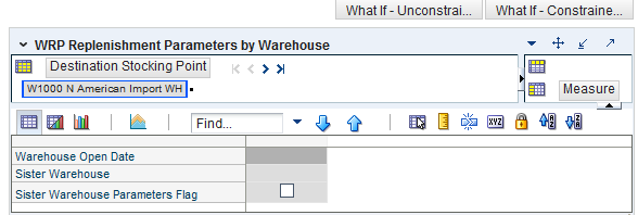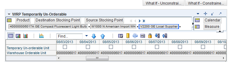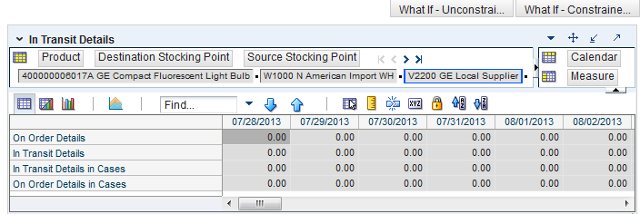 A read-only projected receipt plan of inventory that is cross-docked through the warehouse. When any of the network group SKUs are cross-docked through the warehouse, the individual inventory movements through the supply chain must be considered instead of the constrained plan that represents only the first source and final destination. The total inbound on any given day will consist of the constrained receipt plan and cross-docked receipt plan being shipped into to warehouse that day. |