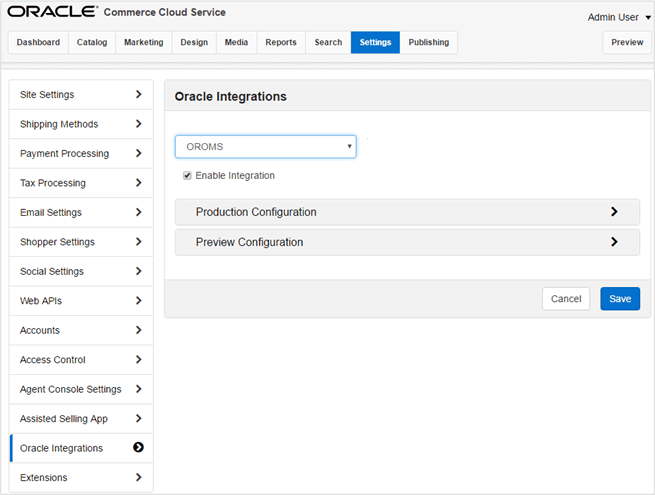 The Oracle Integrations page is managed using the Commerce Cloud administration interface.