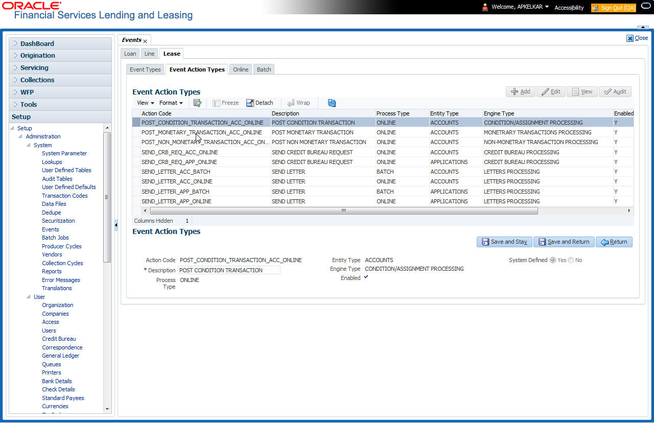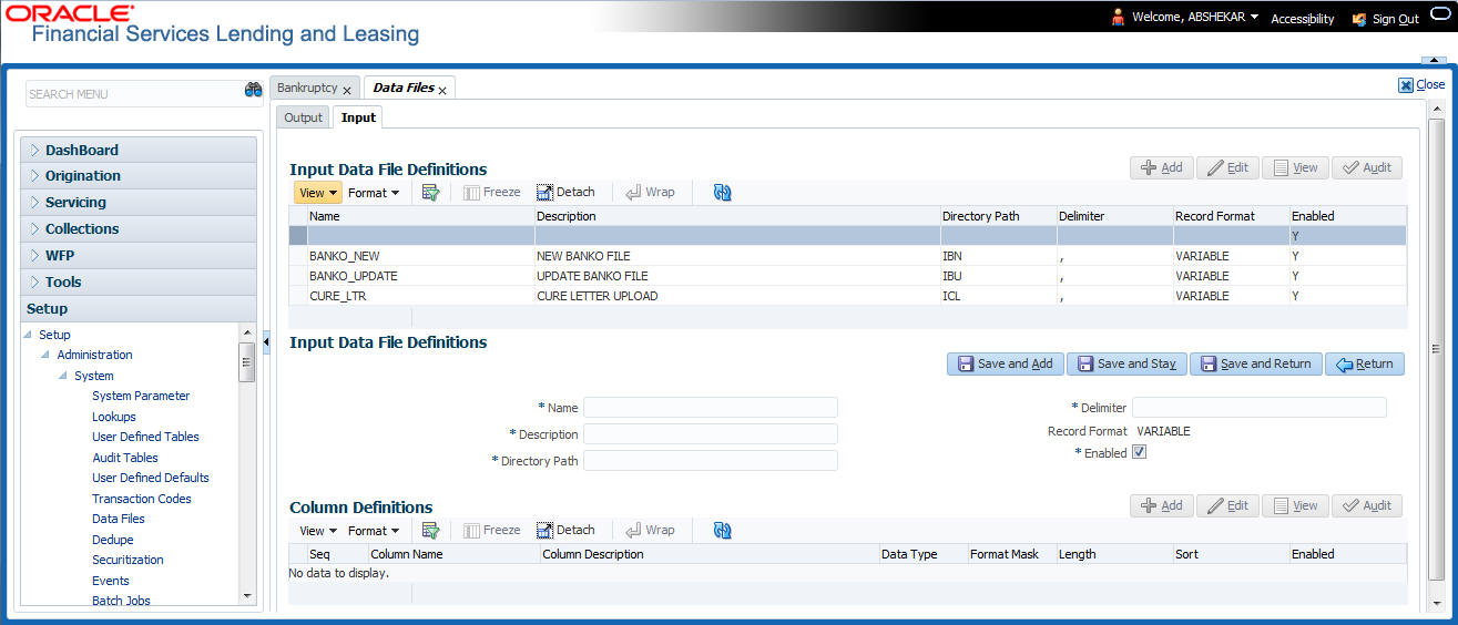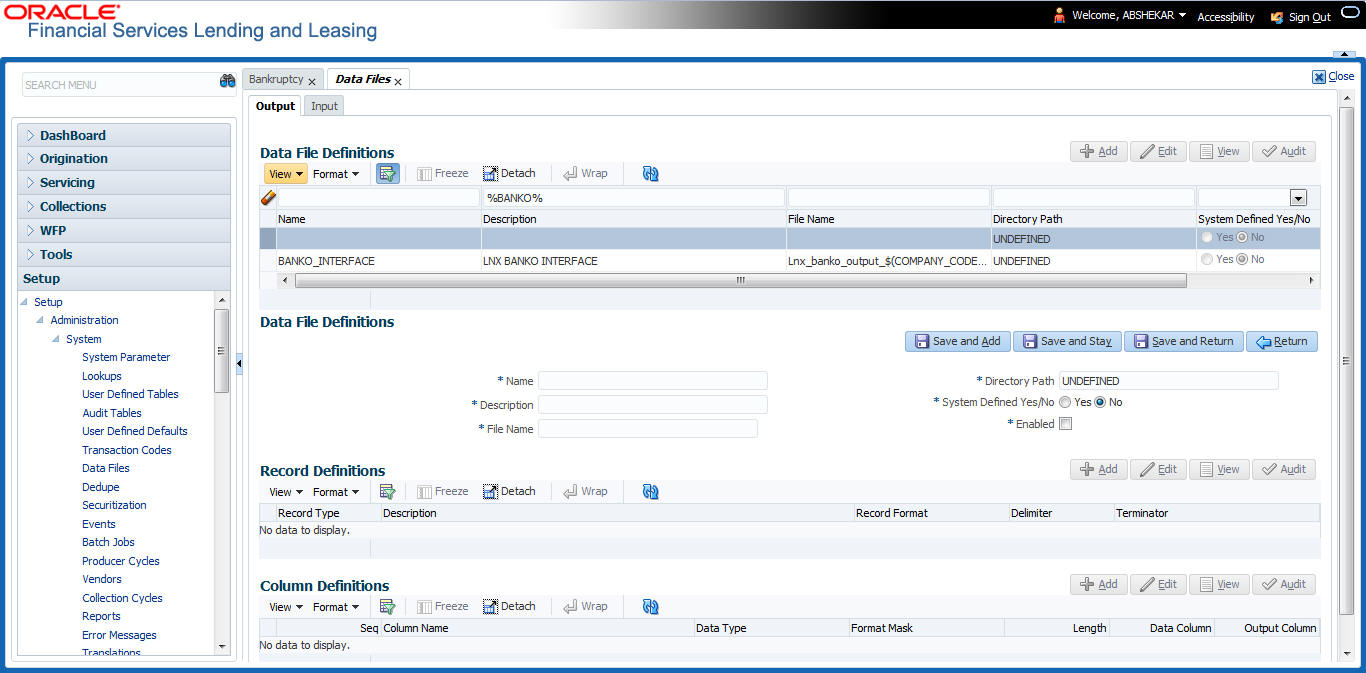 Many of these tables, (Asset Tracking Attributes for example) may be configured during the initial setup of the application to provide for your specific business needs. Others, such as Application Search, may be changed whenever your business needs change. Still others should not be changed without consulting Oracle Financial Services Software, as changing them would require changes to existing code for the expected results to be implemented. As a thumb rule, it is better to add or disable information on the User Defined Tables screen than to edit existing entries.