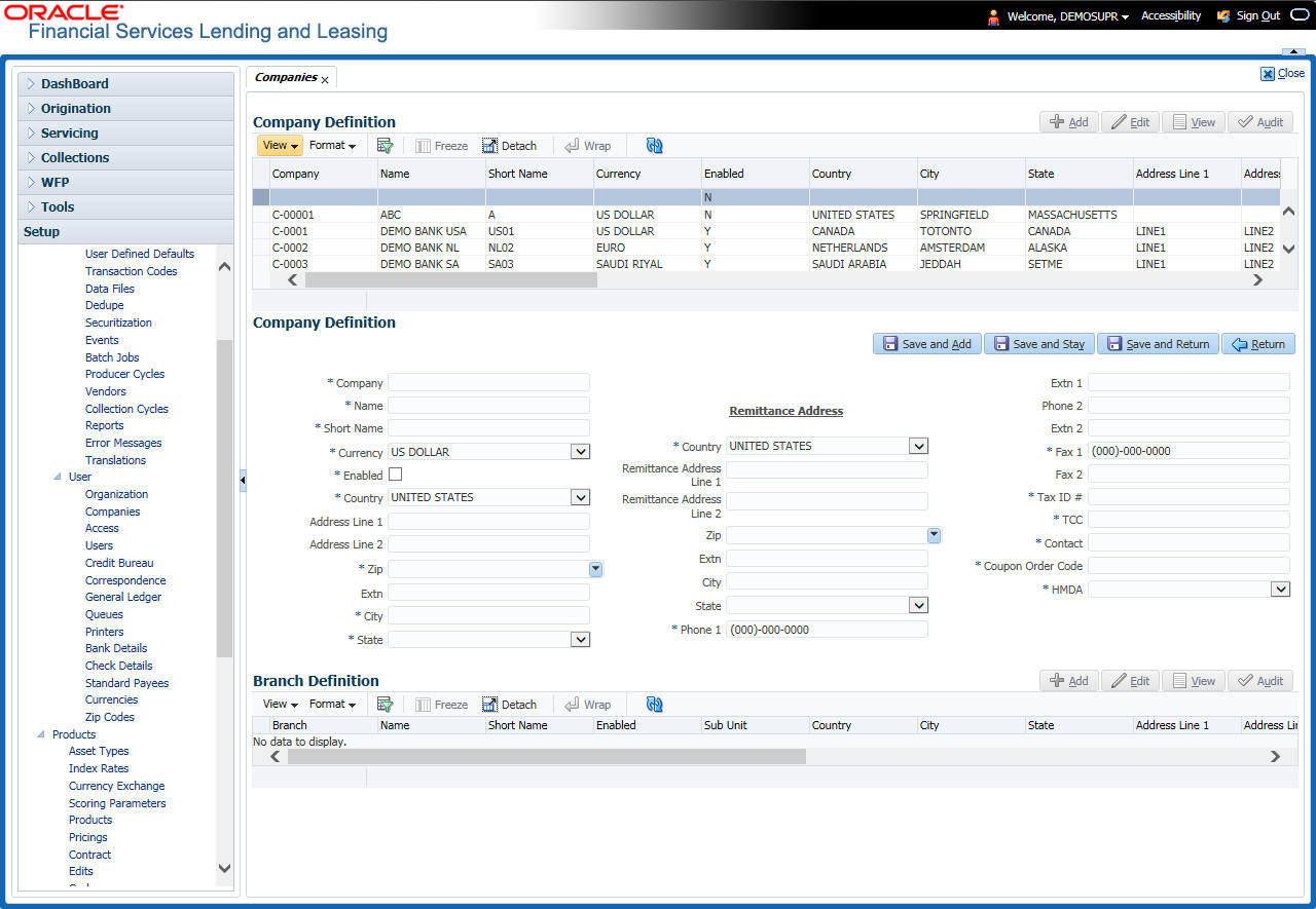 The Short Name field on the Organization screen allows you to create the ID that Oracle Financial Services Lending and Leasing will use when referring to the organization, division, and department throughout the system.