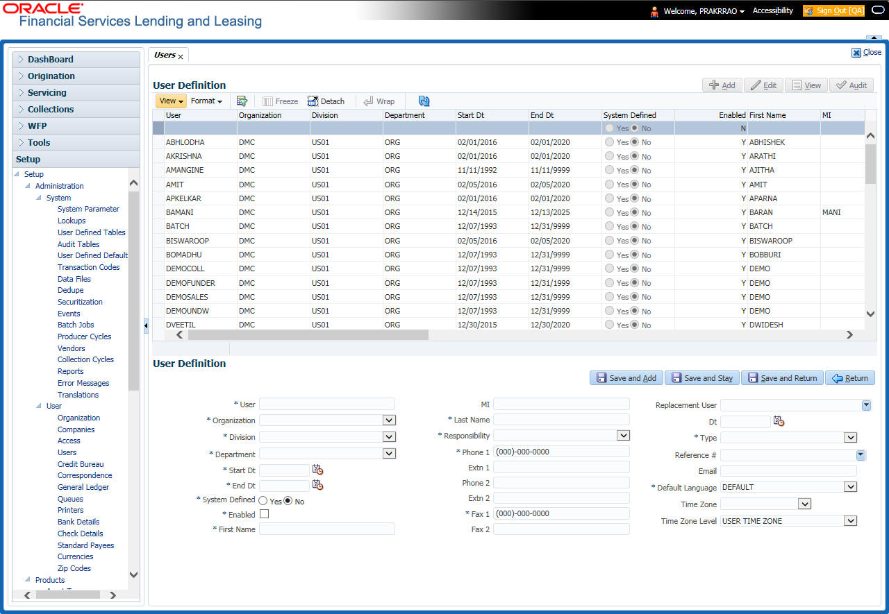 In the Administration > User, you can record setup data that define your organization structure and its users. Information in this link is more “data” related, whereas the information stored on the System drop-down link functions more like switches that control system behavior.