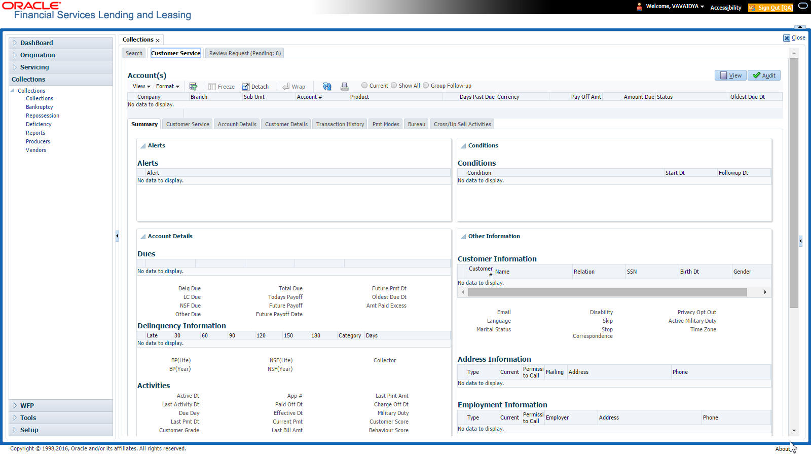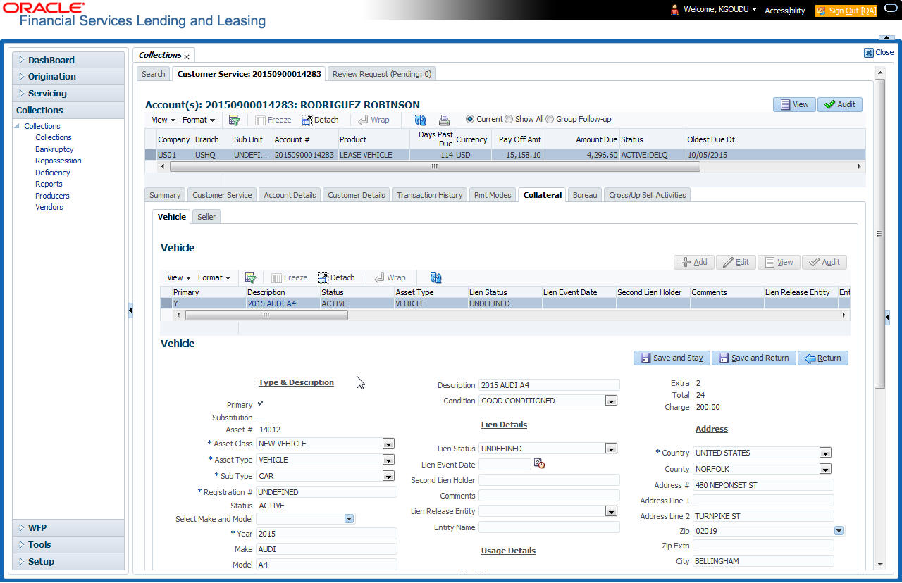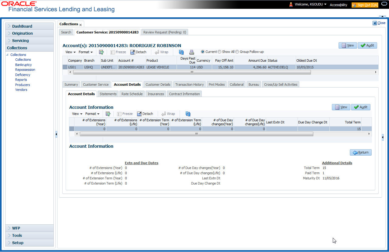 After an application has cycled through the Lease origination process, it becomes an account. Account maintenance and collections tasks can be performed with Oracle Financial Services Lending and Leasing’s Repossession screen.