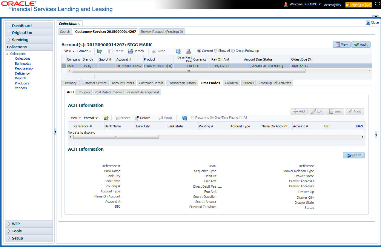 Open the Repossession screen and load the account you want to work with. Click the Pmt Modes sub tab to view the sections under it.