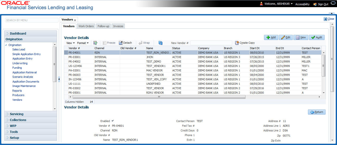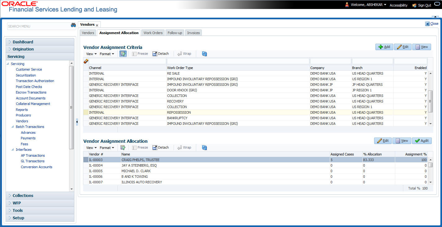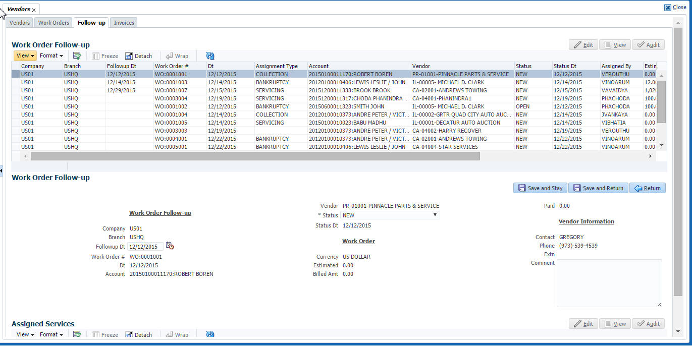 During the life of an account, a financial institution might require the use of specialized services of a vendor for various purposes; for example, repossessing a vehicle, retaining an attorney for bankruptcy court proceedings or making field calls. With the system’s Vendors screen, you can: