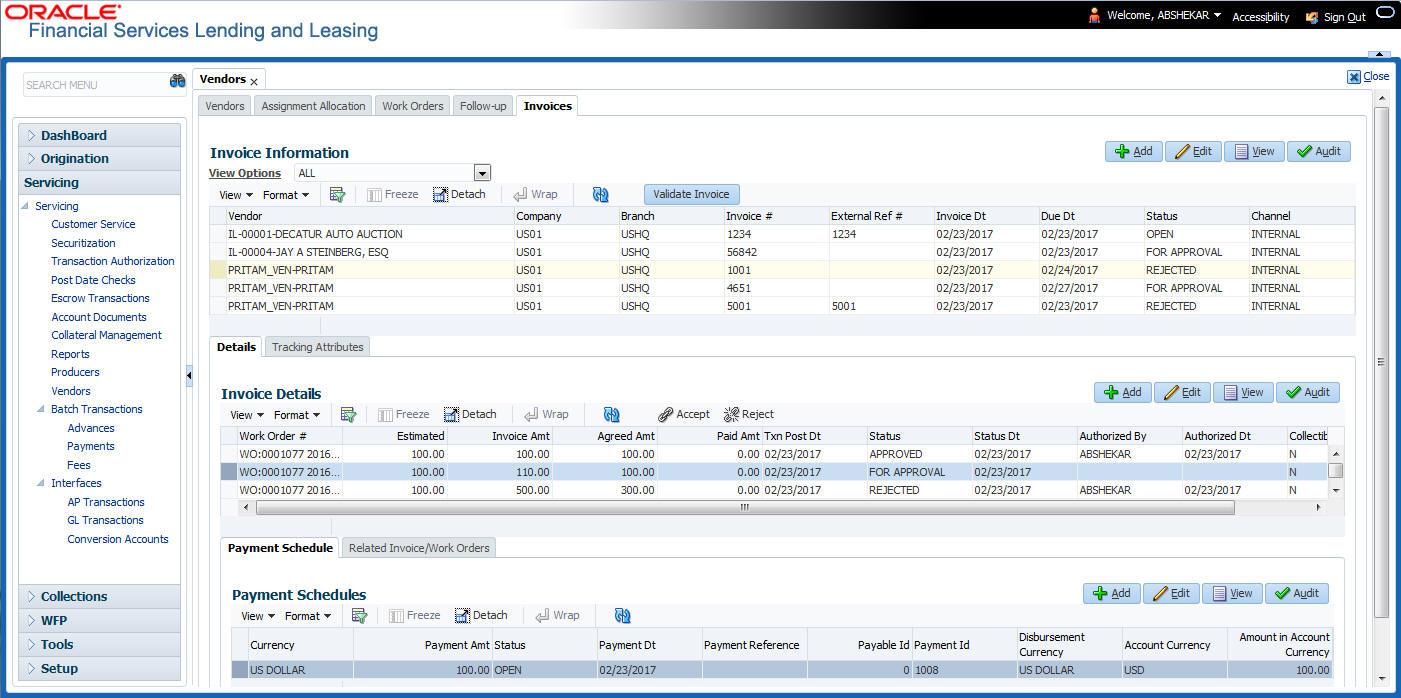 An invoice status in Invoice Information section is auto updated to “APPROVED’ if both Invoice Details and Payment Schedules have the same status. Else, if status is rejected in either of the sections, the status of invoice is also updated as ‘REJECTED’ in Invoice Information section without allowing further edits on the same.