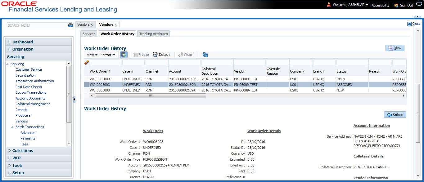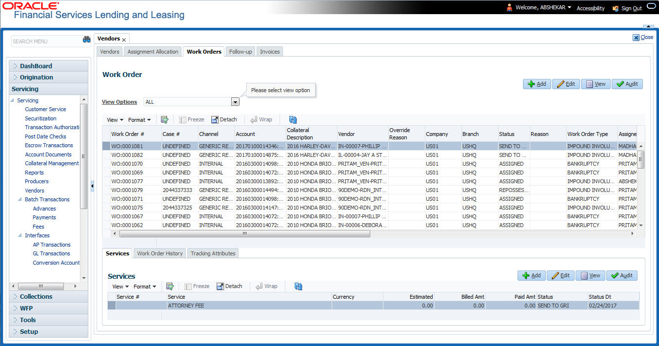 Select the work order from the drop-down list. This list displays the generated work orders. Each work order name is defined in the format which consists of work order number, account number, service number and service name. |