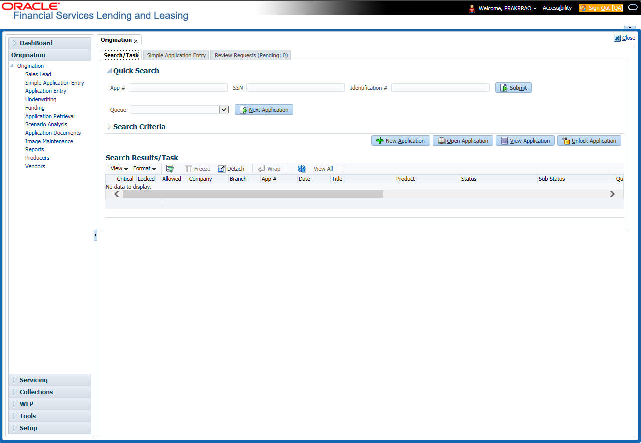 The first step in the Lease origination process is entering credit application data into Oracle Financial Services Lending and Leasing Application. The Simple Application Entry screen enables you to specify information from the credit application into the system and request a credit bureau report.