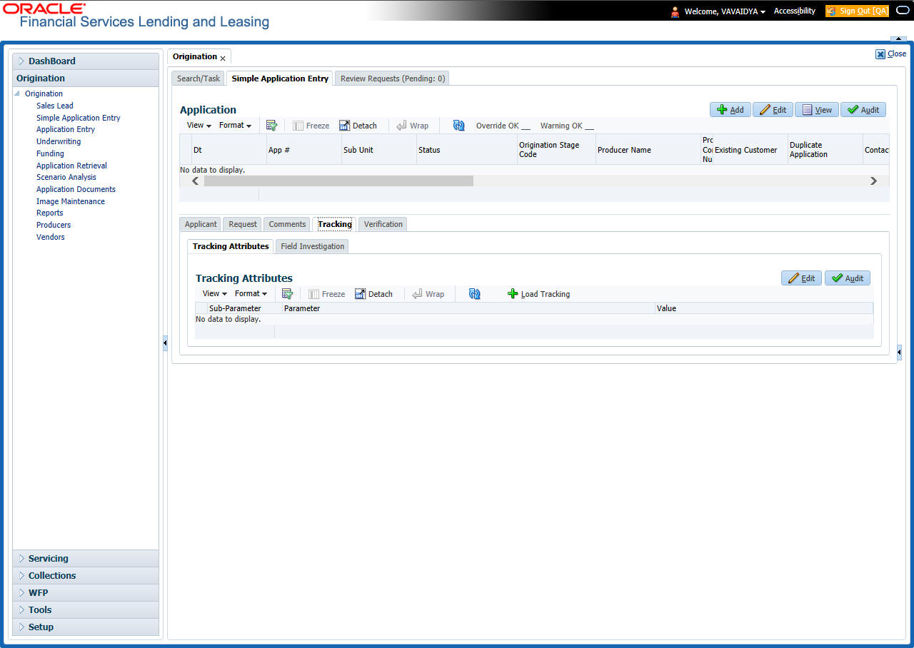 When finished, Oracle Financial Services Lending and Leasing checks the application for completeness using a predefined set of edits. These edits search for errors and warnings based on your system setup. Status change of the application can be determined by the credit bureau and scoring model of the application. The prescreening checks ensure that automatic credit bureau reports are pulled only for applications which meet set criteria, thus saving cost.