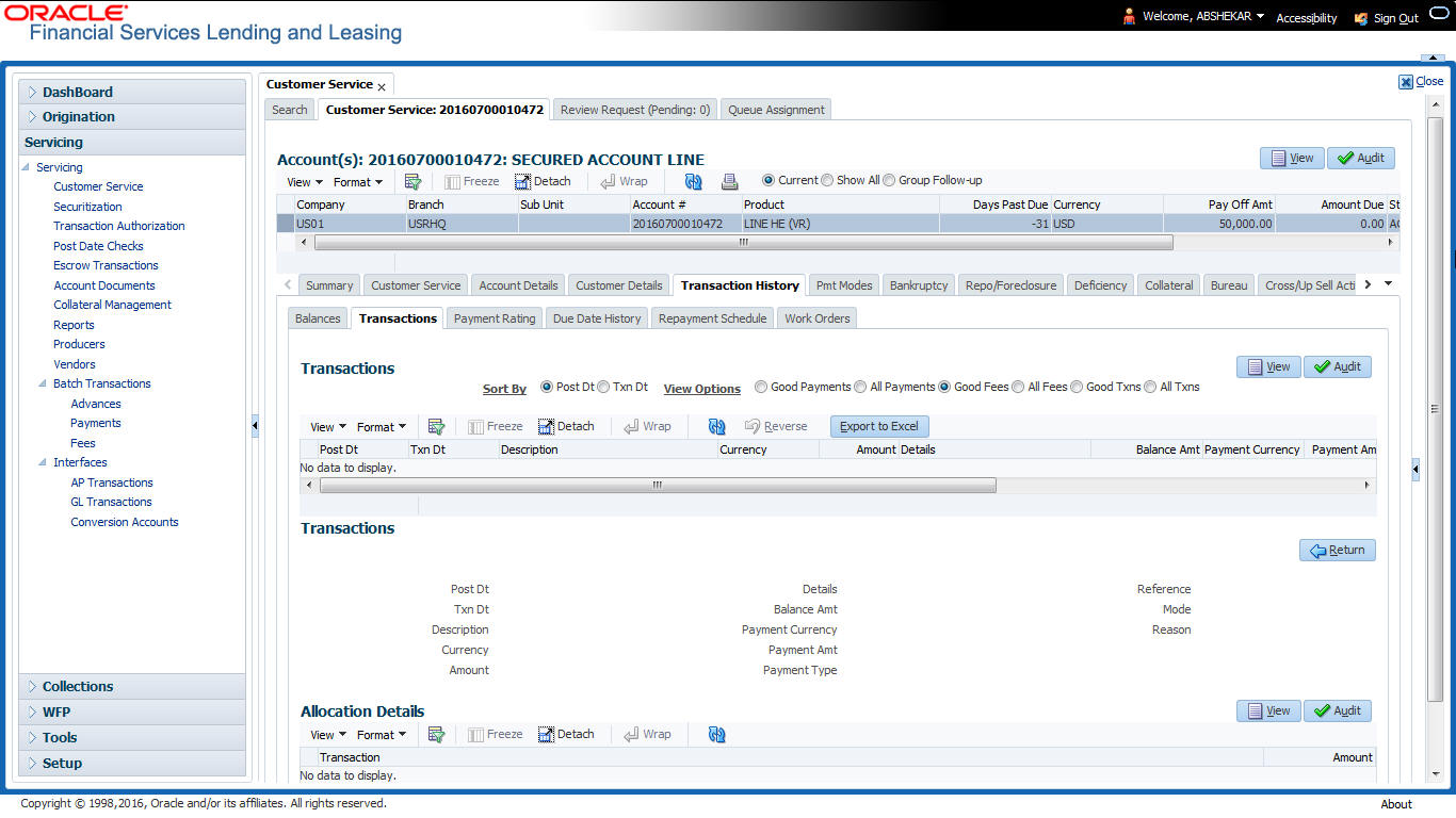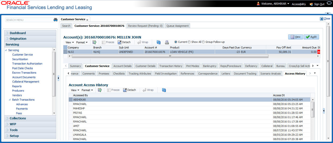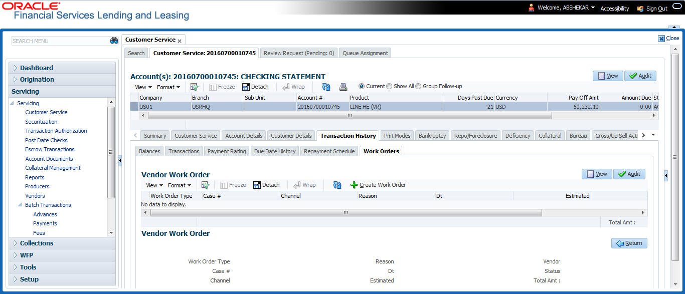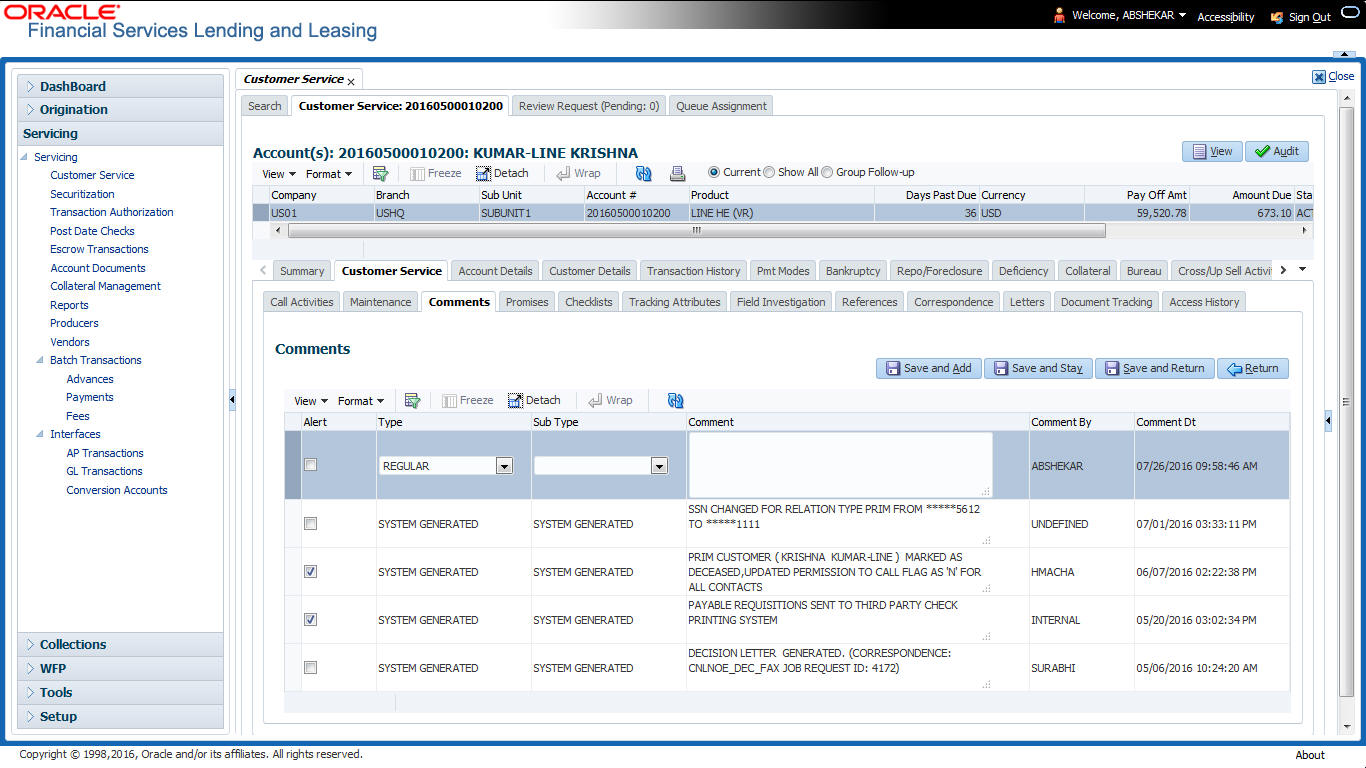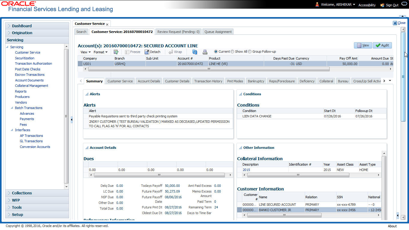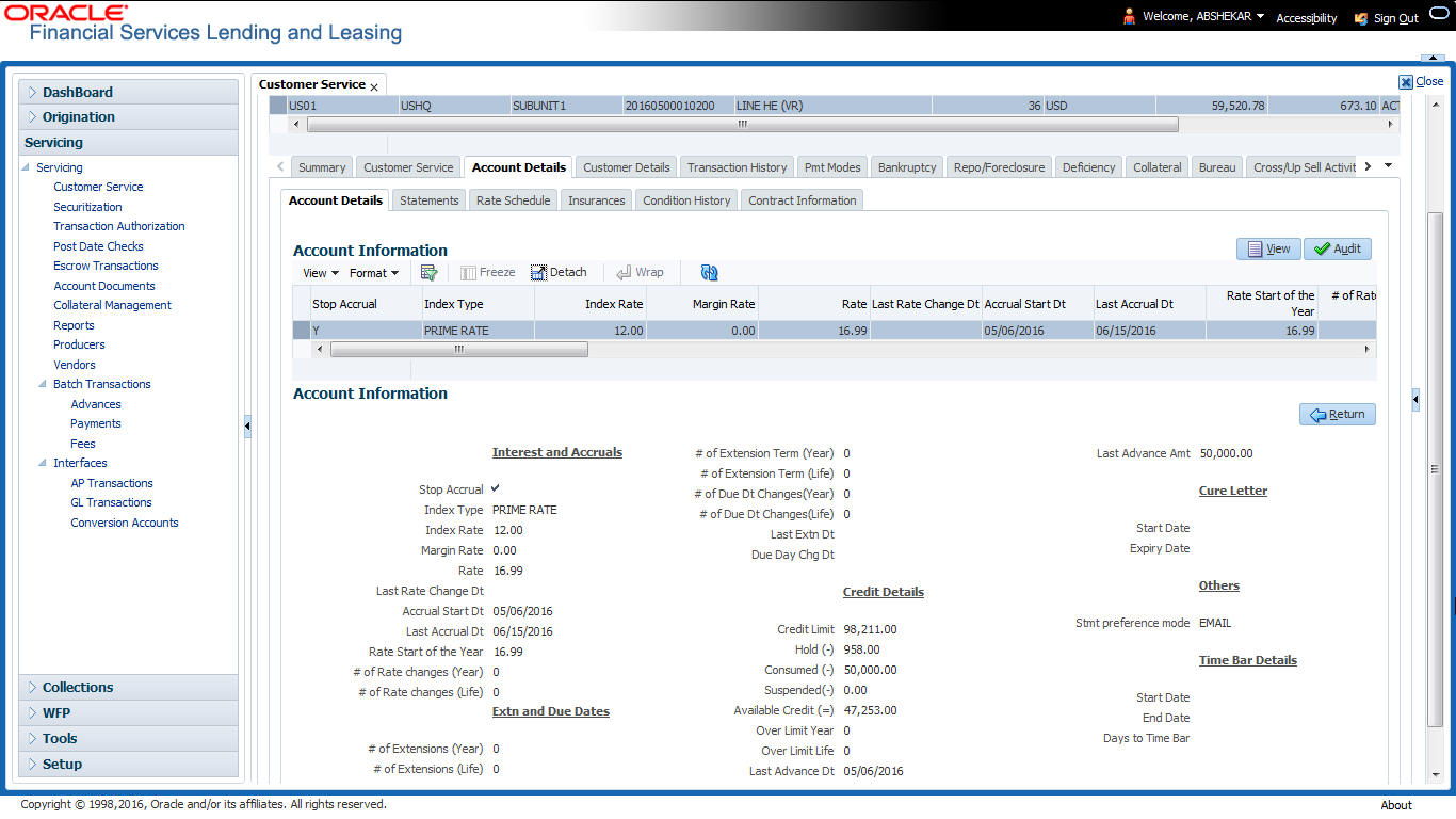 After an application has cycled through the Line of credit origination process, it becomes an account. Account maintenance and collections tasks can be performed with Oracle Financial Services Lending and Leasing’s Customer Service screen.