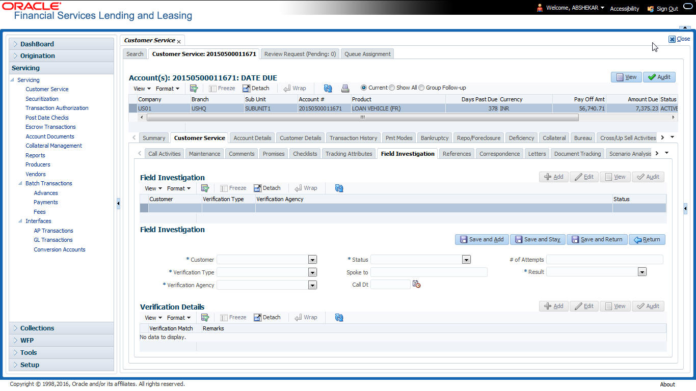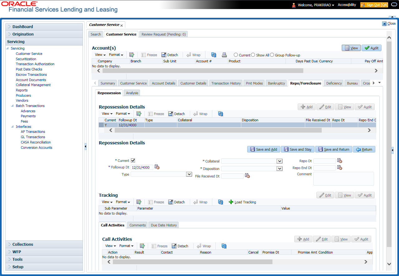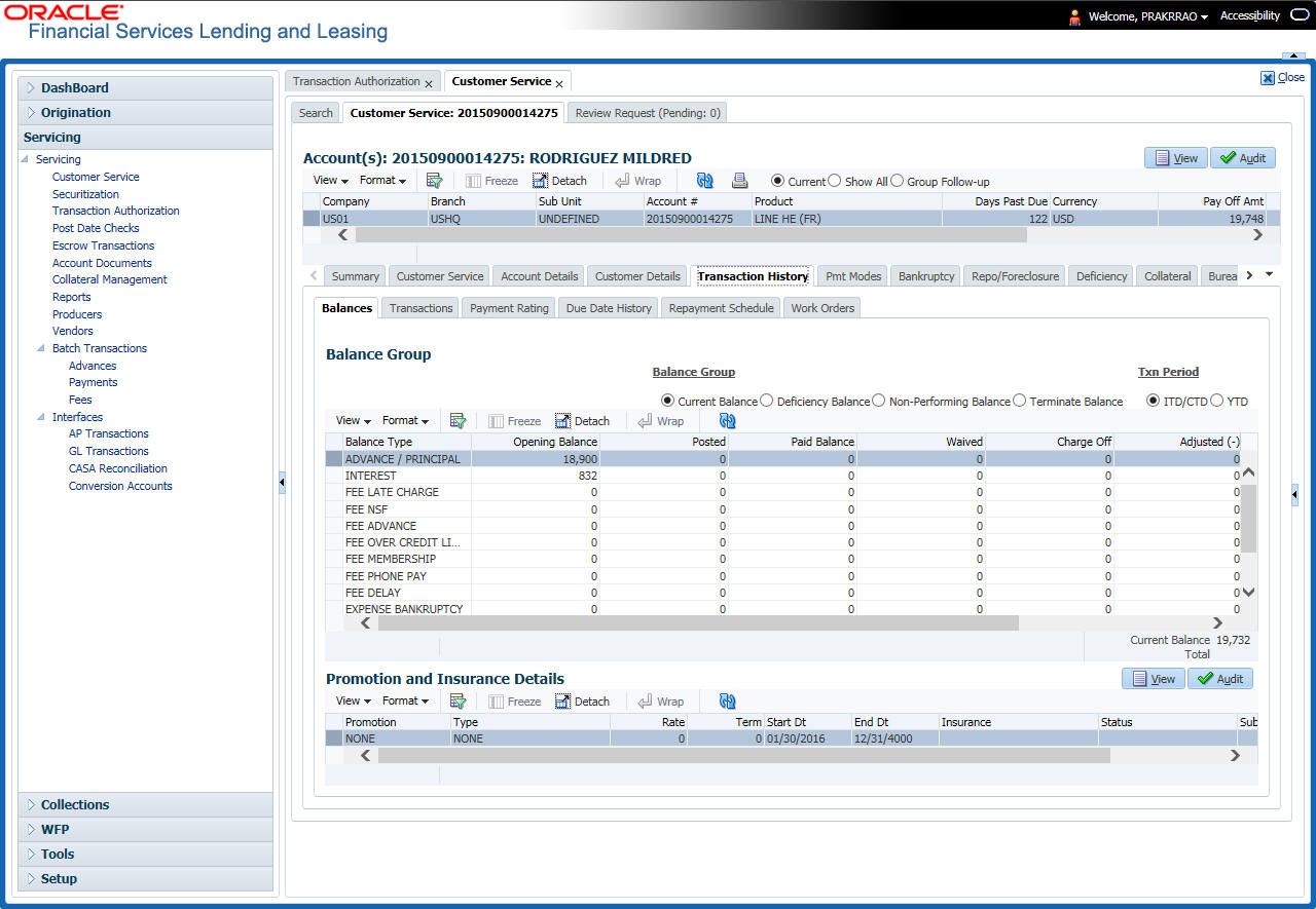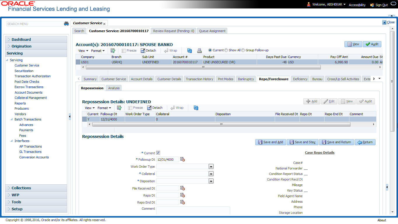 After an application has cycled through the Line of credit origination process, it becomes an account. Account maintenance and collections tasks can be performed with Oracle Financial Services Lending and Leasing’s Customer Service screen.
