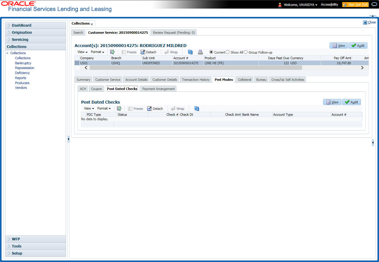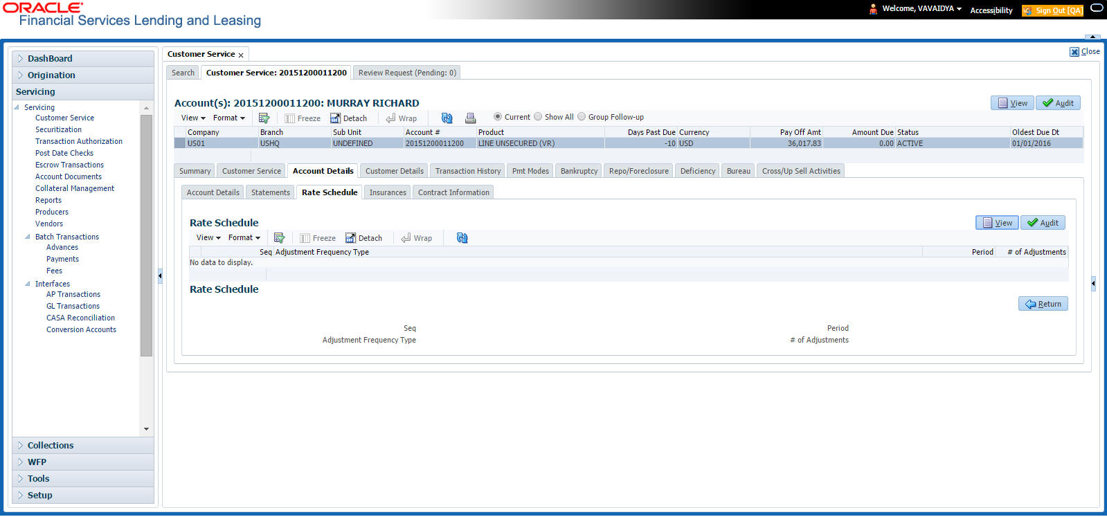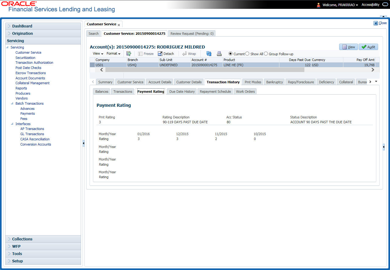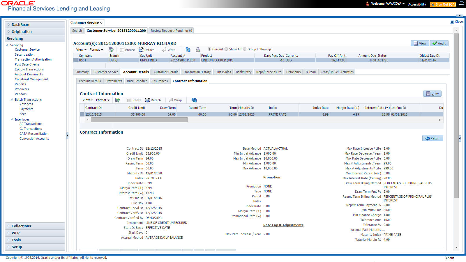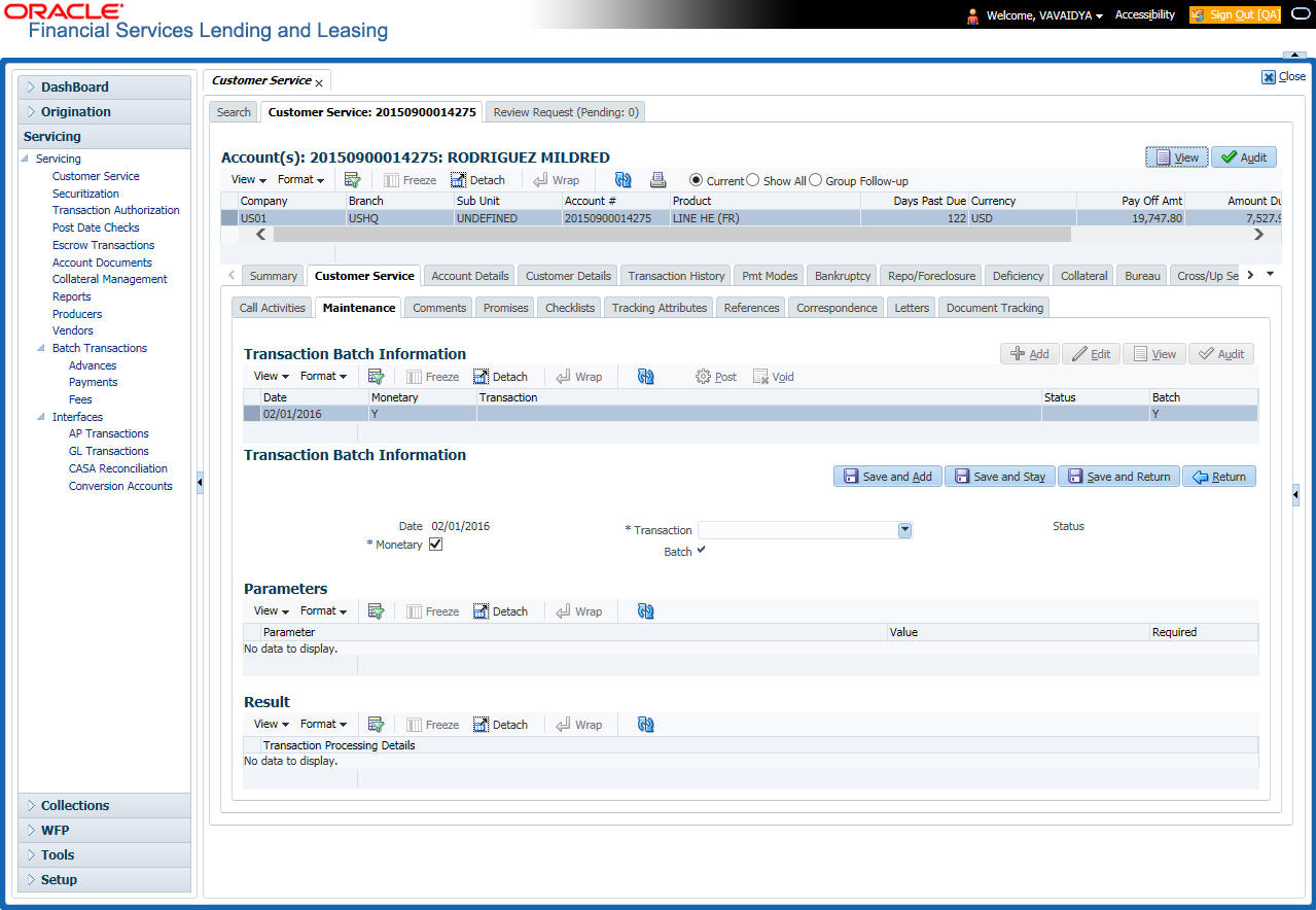 After an application has cycled through the Line of credit origination process, it becomes an account. Account maintenance and collections tasks can be performed with Oracle Financial Services Lending and Leasing’s Customer Service screen.