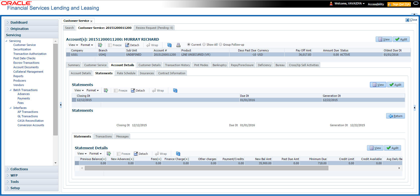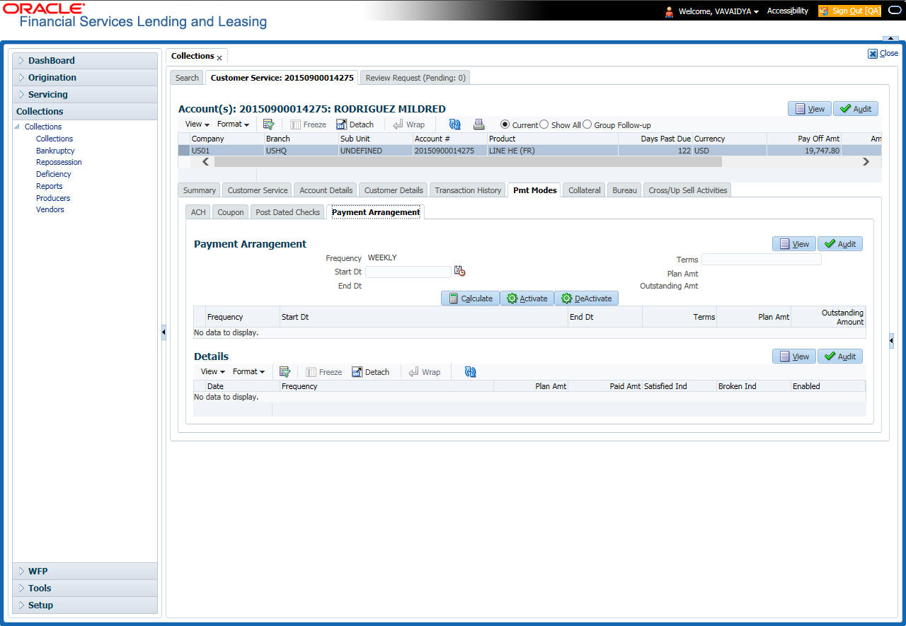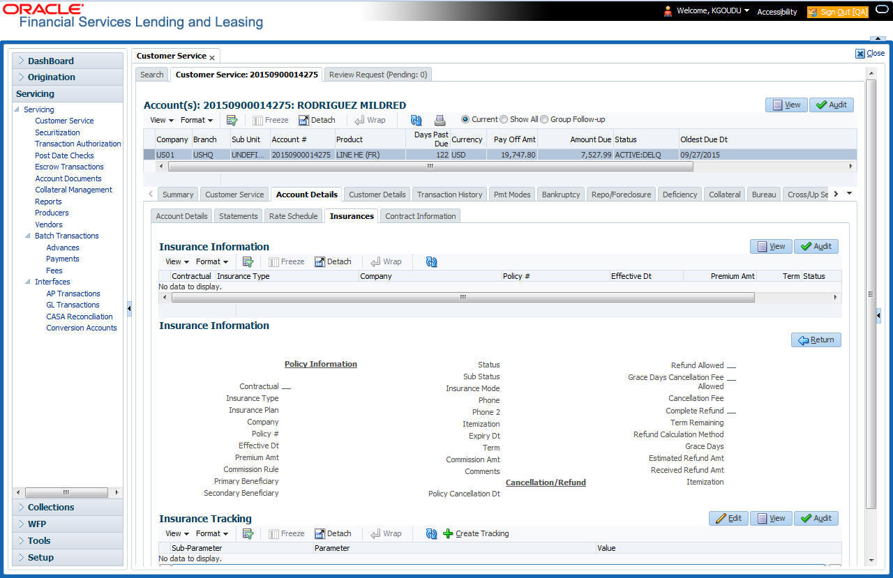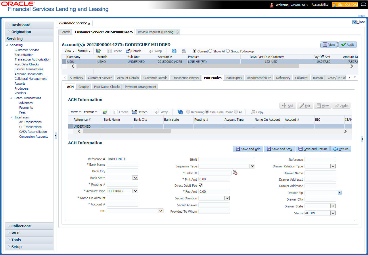 After an application has cycled through the Line of credit origination process, it becomes an account. Account maintenance and collections tasks can be performed with Oracle Financial Services Lending and Leasing’s Customer Service screen.