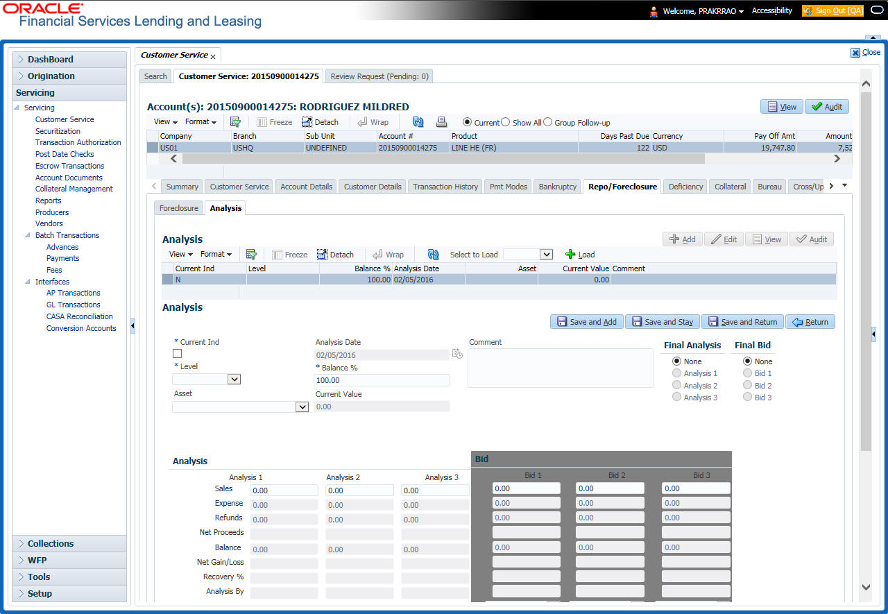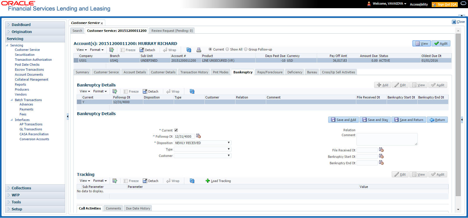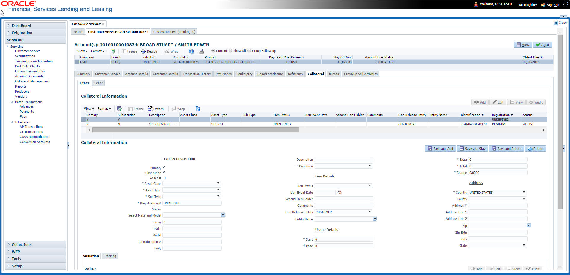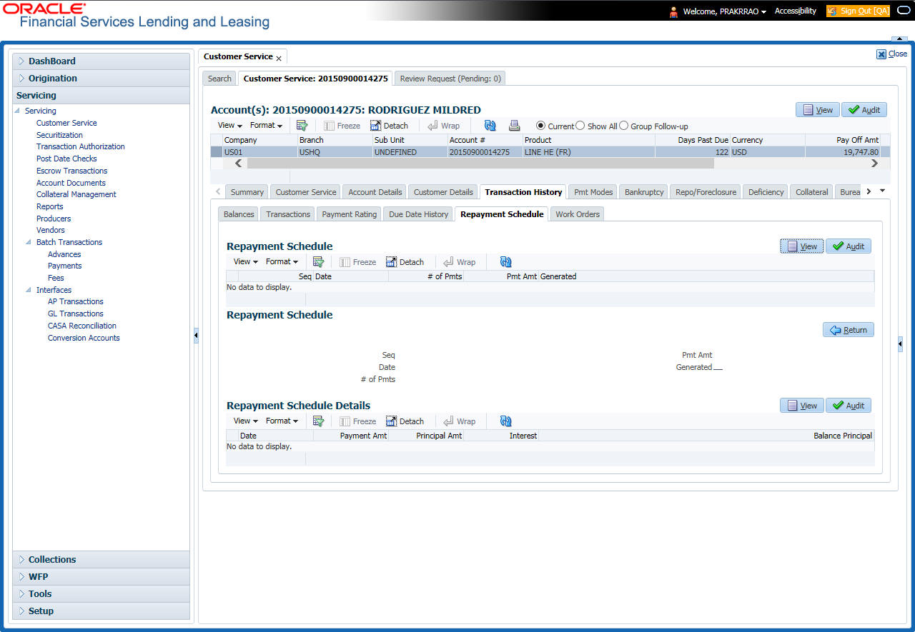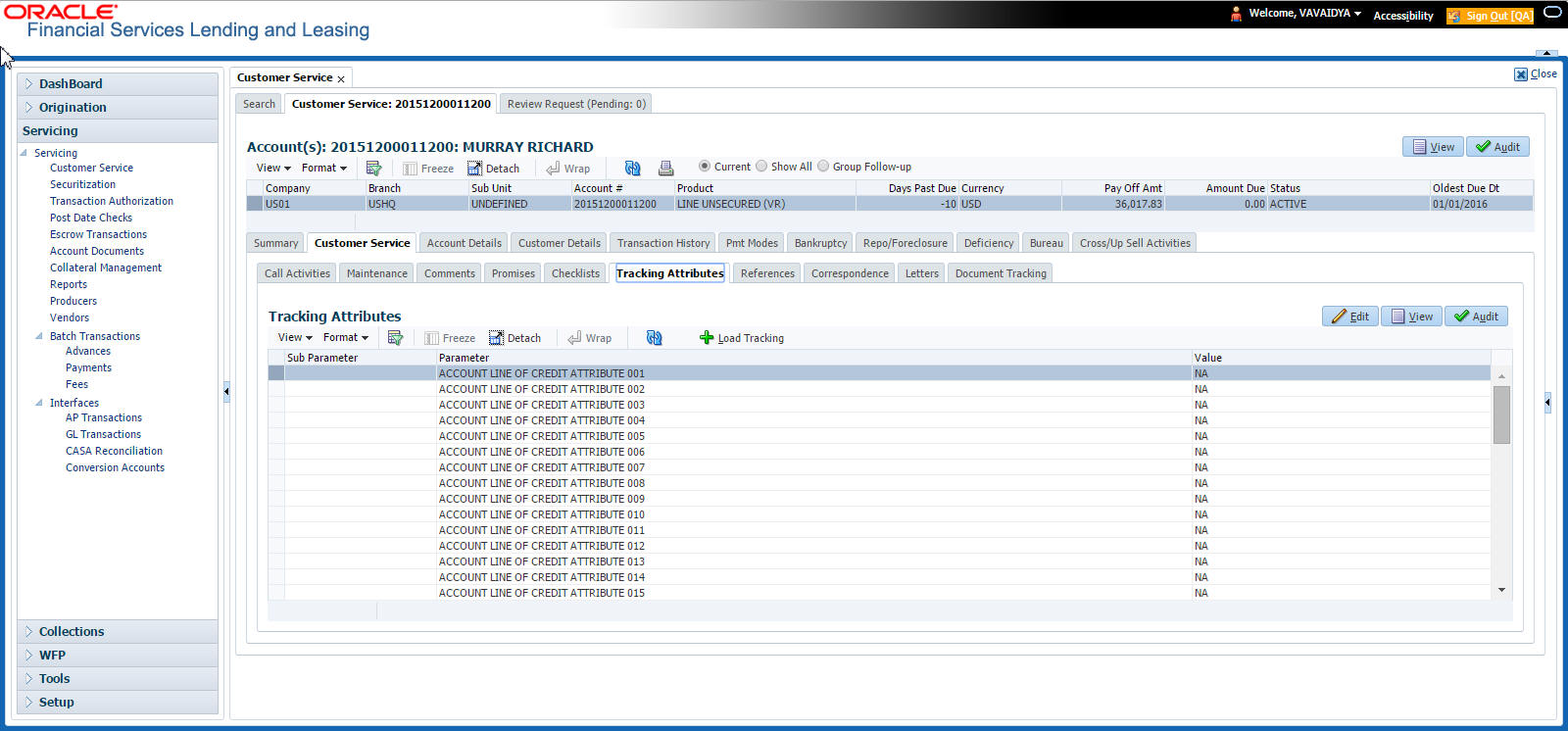 After an application has cycled through the Line of credit origination process, it becomes an account. Account maintenance and collections tasks can be performed with Oracle Financial Services Lending and Leasing’s Customer Service screen.