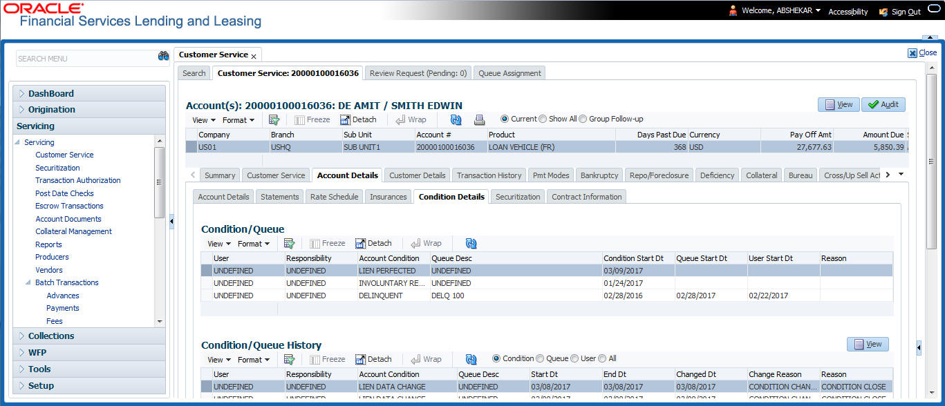 You can view any conditions like Bankruptcy, Repossession, Foreclosure etc posted on an account. The condition is posted in the account with a start date which is the effective date and follow up date which indicates the next follow-up date for further process.