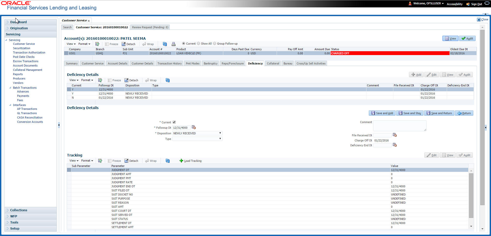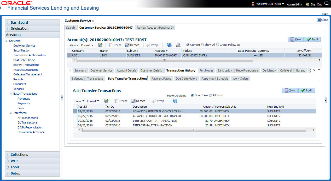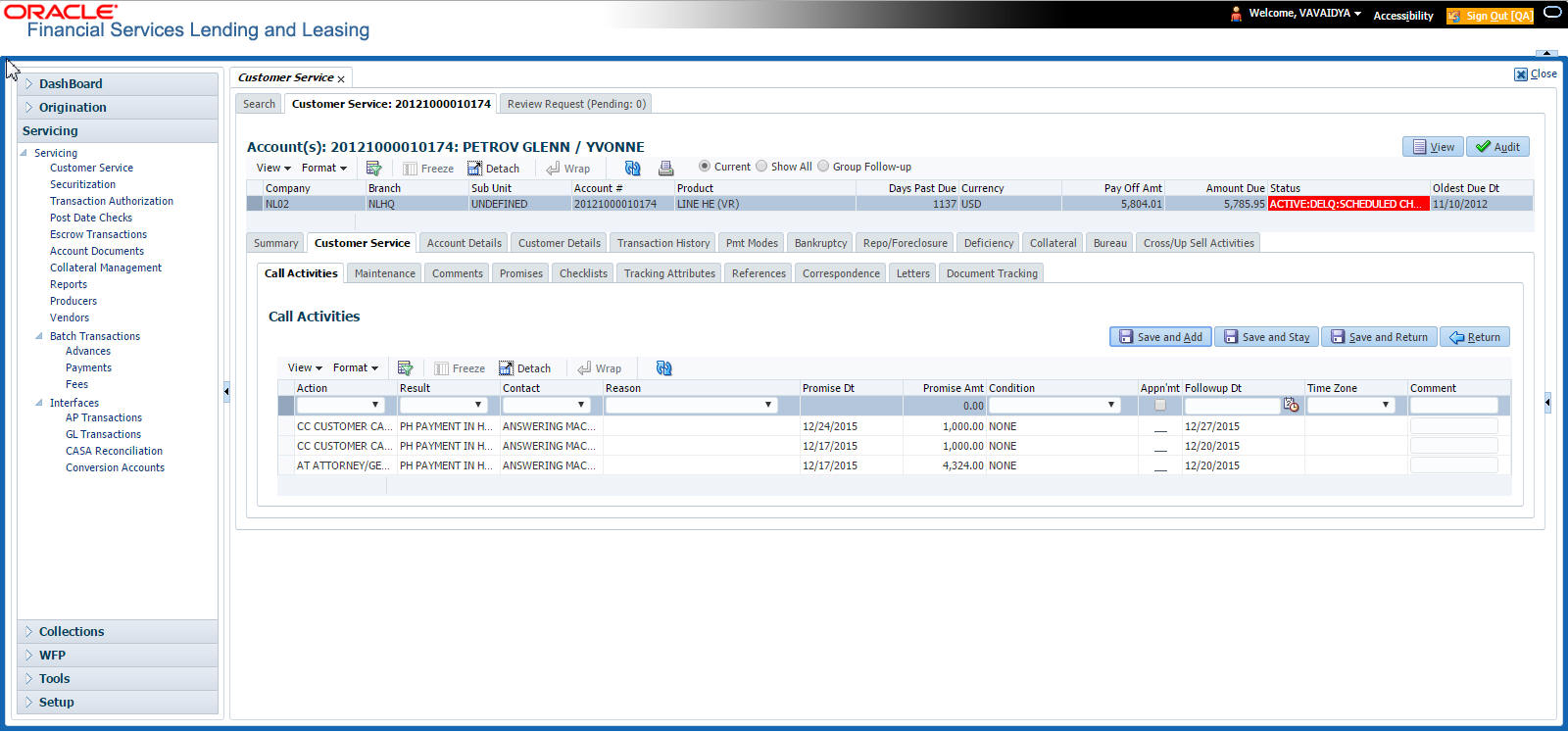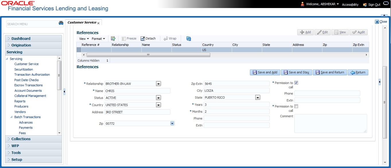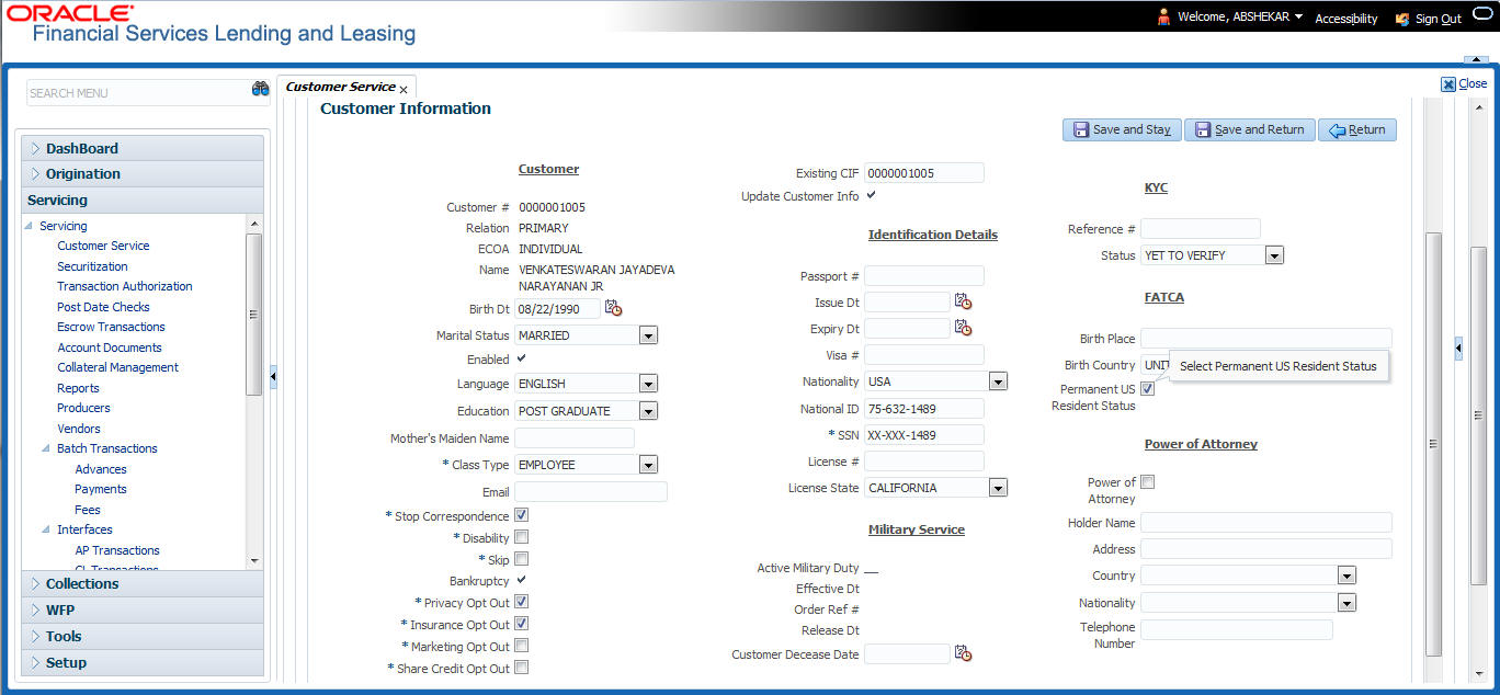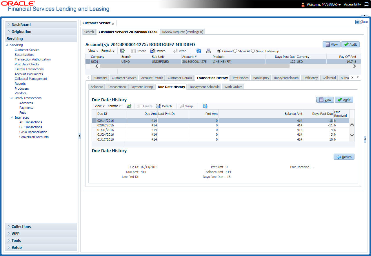 The Customer Service screen enables you to view and manage all customer information in a centralized location to ensure data integrity and provide better service. Oracle Financial Services Lending and Leasing provides online real-time information about the applicant(s), contract, account balances, dues, transactions, call activities, and comments. Oracle Financial Services Lending and Leasing also supports back-dating of financial transactions till the account’s opening date.