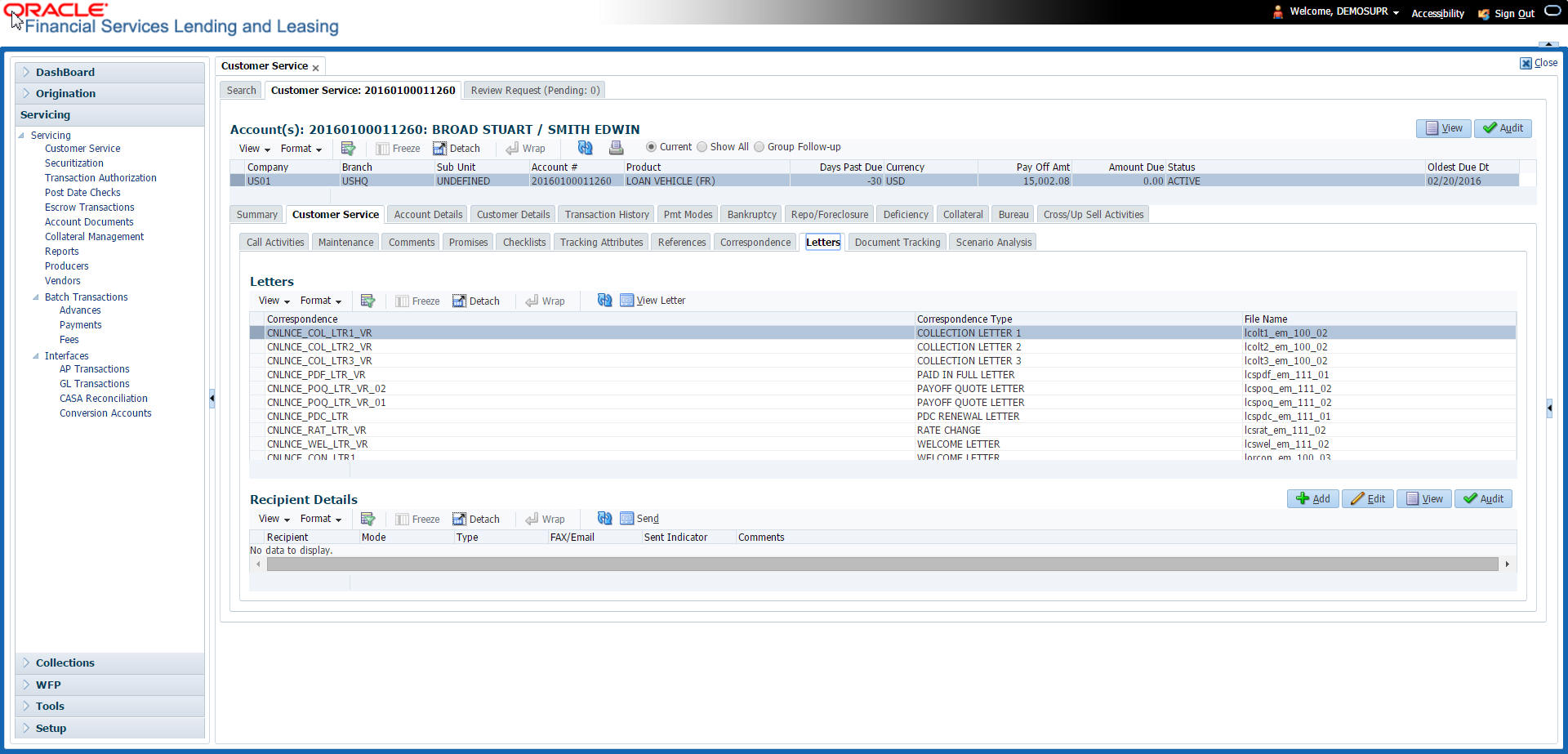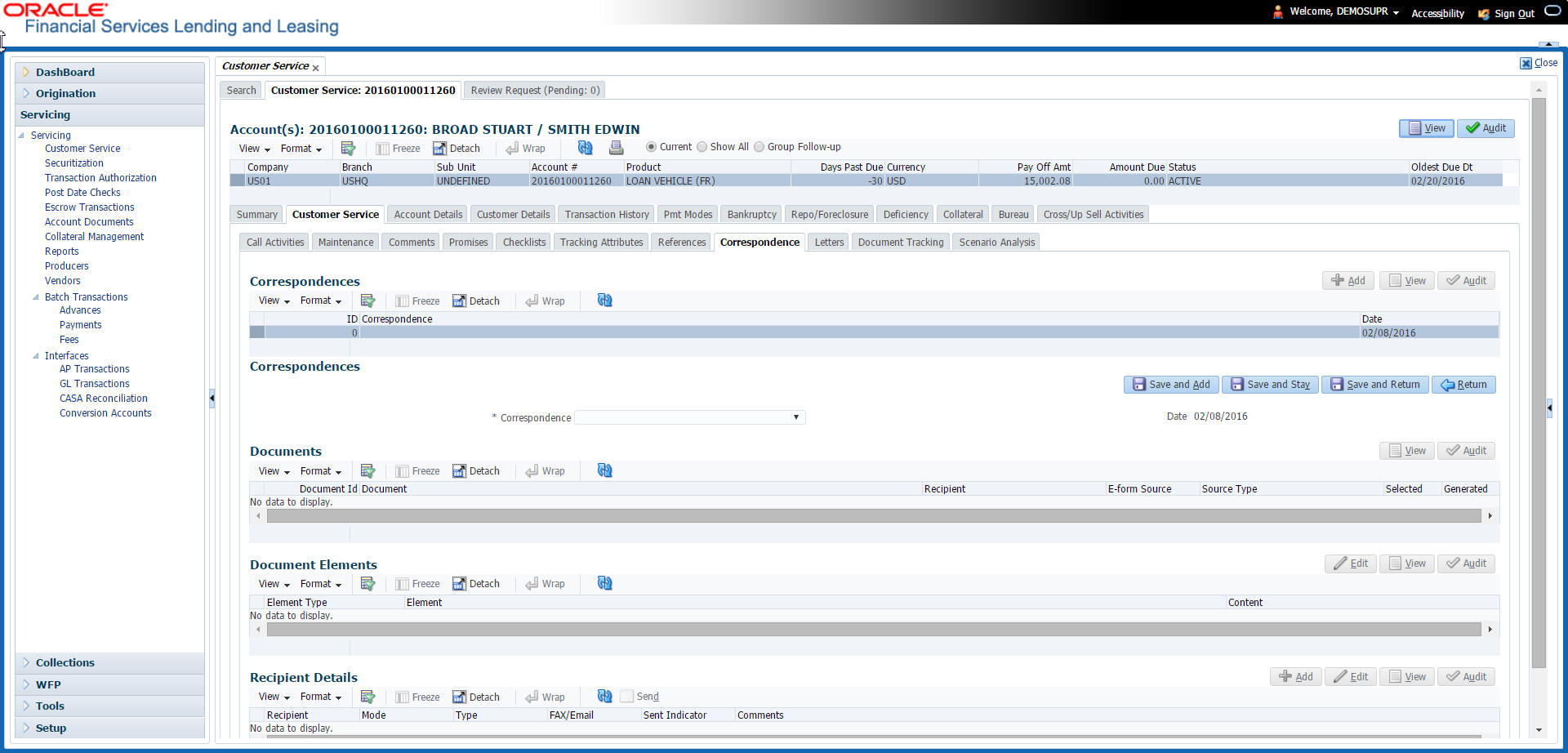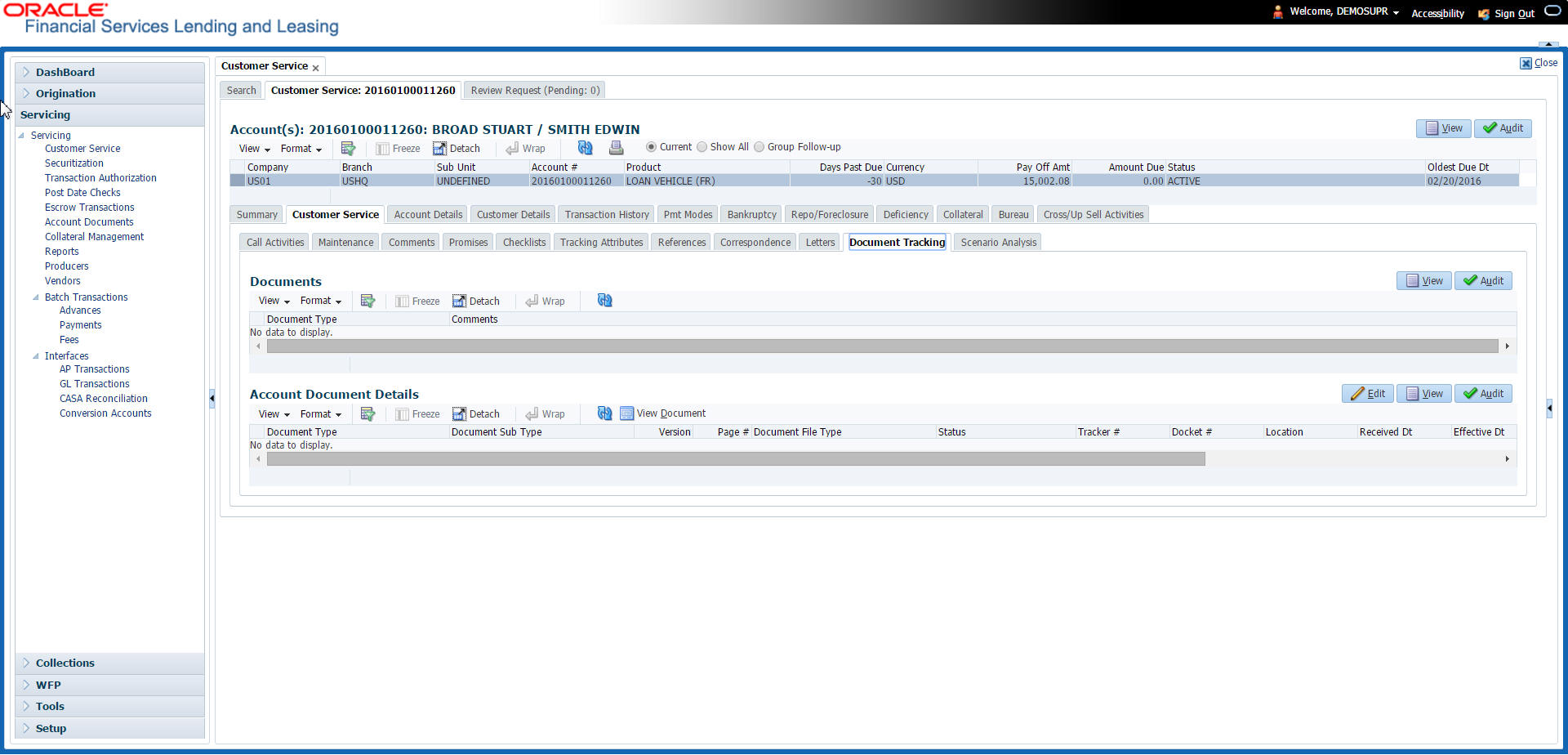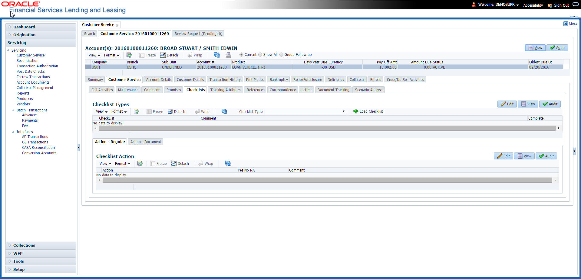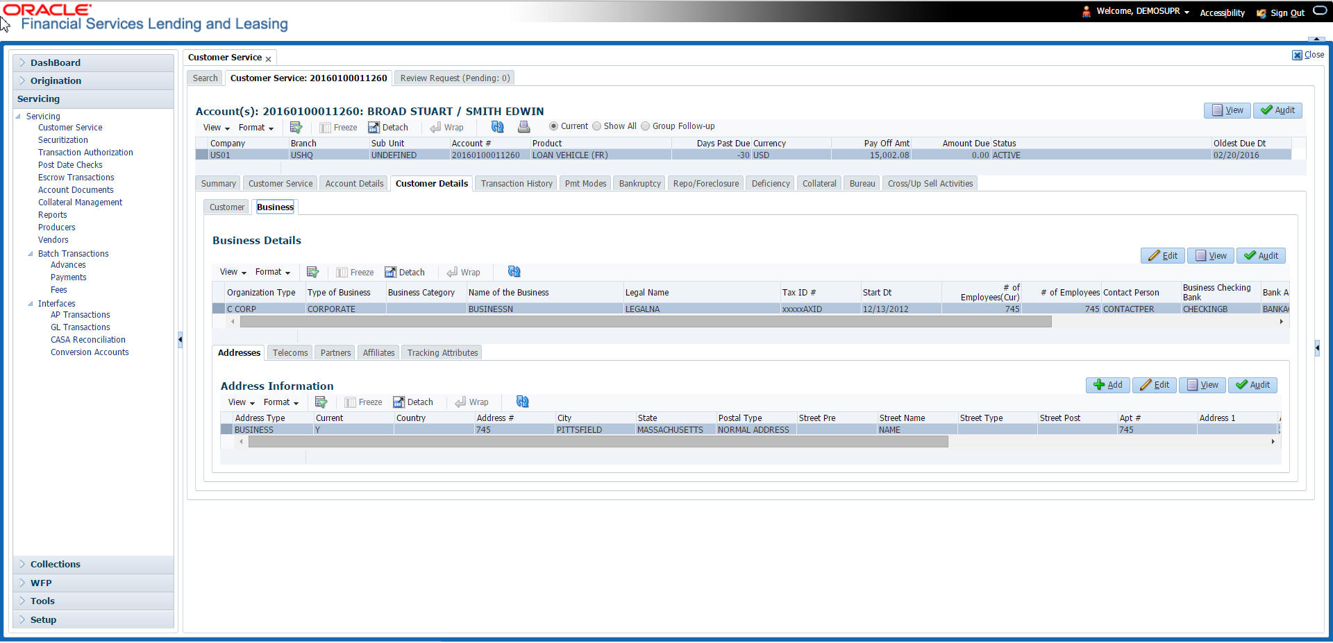 The Customer Service screen enables you to view and manage all customer information in a centralized location to ensure data integrity and provide better service. Oracle Financial Services Lending and Leasing provides online real-time information about the applicant(s), contract, account balances, dues, transactions, call activities, and comments. Oracle Financial Services Lending and Leasing also supports back-dating of financial transactions till the account’s opening date.