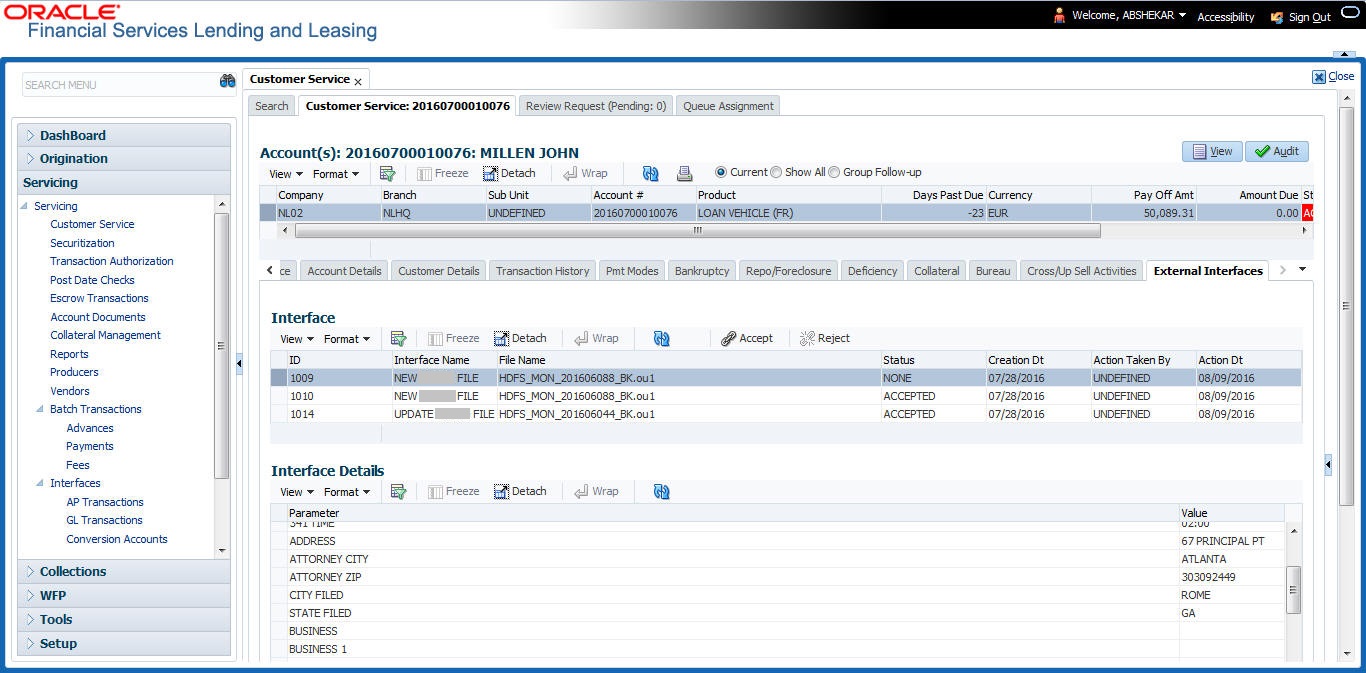 In the External Interfaces tab you can Accept or Reject information of those records which are specific to bankruptcy update and marked with status as ‘None’.