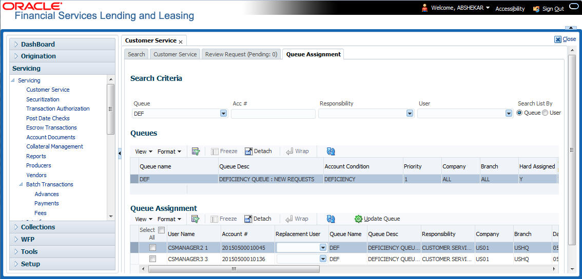 The Queue Assignment tab in Oracle Financial Services Lending and Leasing application allows you to search and view the hard assigned customer service queues maintained in the system. You can also view the queue assignment details and reassign users in a hard assigned queue.