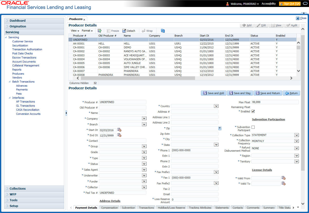 Oracle Financial Services Lending and Leasing is capable to create and service direct as well as indirect Line of credit. Indirect Line of credit are generated through Producer Entities like Dealerships and Agents. It is essential to create and maintain such entities to enable incentive tracking and business development achieved through each entity.