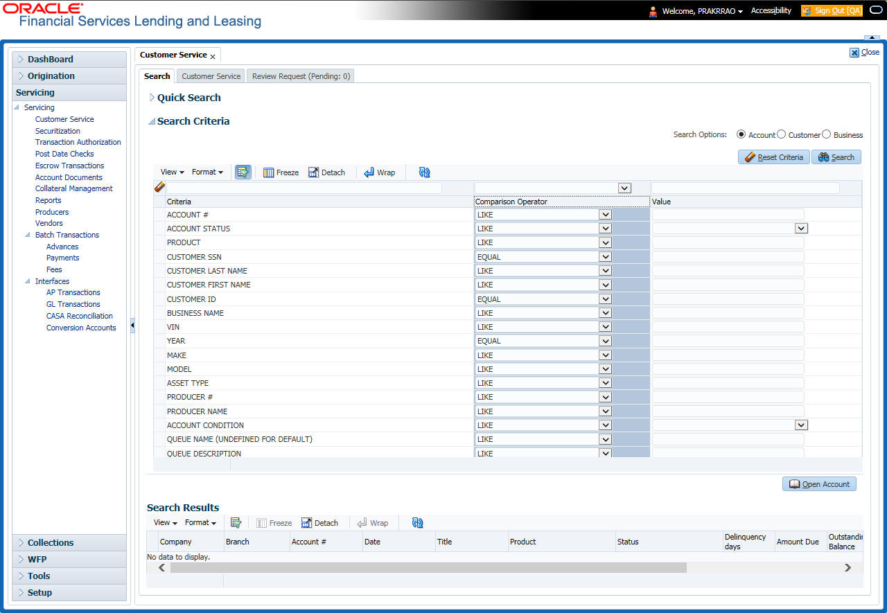 On the Oracle Financial Services Lending and Leasing home screen, click Servicing > Servicing > Customer Service > Search Criteria