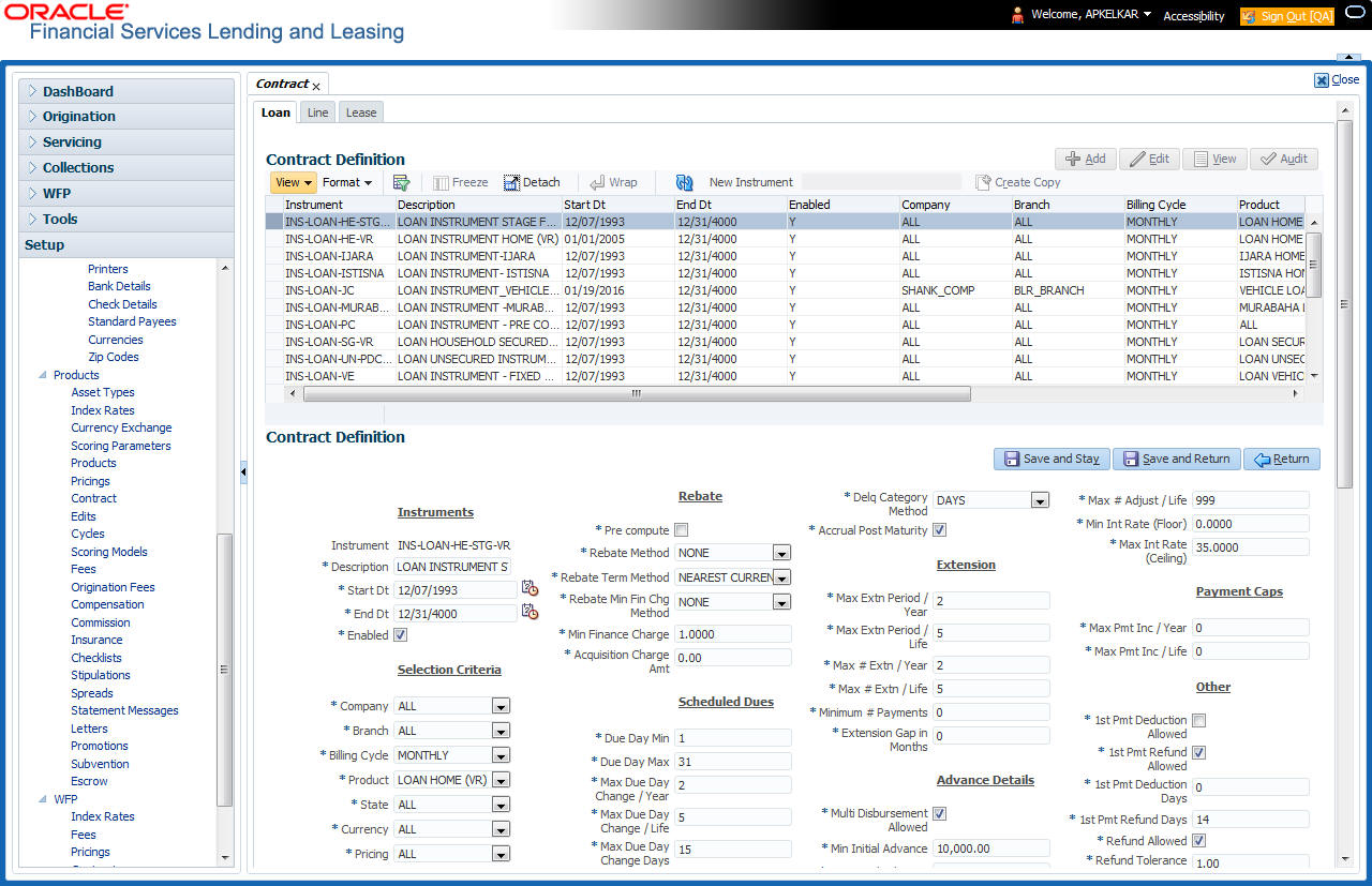 The Contract screen allows you to define the instruments used within your system. A instrument is a contract used by a financial organization with specific rules tied to it. When processing an application, an instrument associated with the application informs the system of the type of contract being used for the approved loan. This ensures that all parameters tied to the instrument are setup for the account as it is booked - without requiring you to do it.