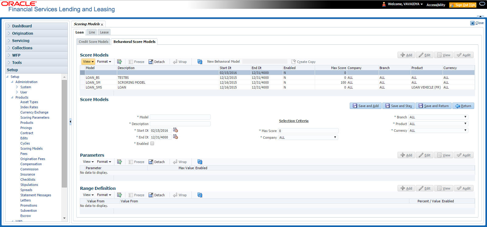 With the Scoring Parameters, you can define the scoring parameters of a company’s credit scorecard and behavioral scoring.