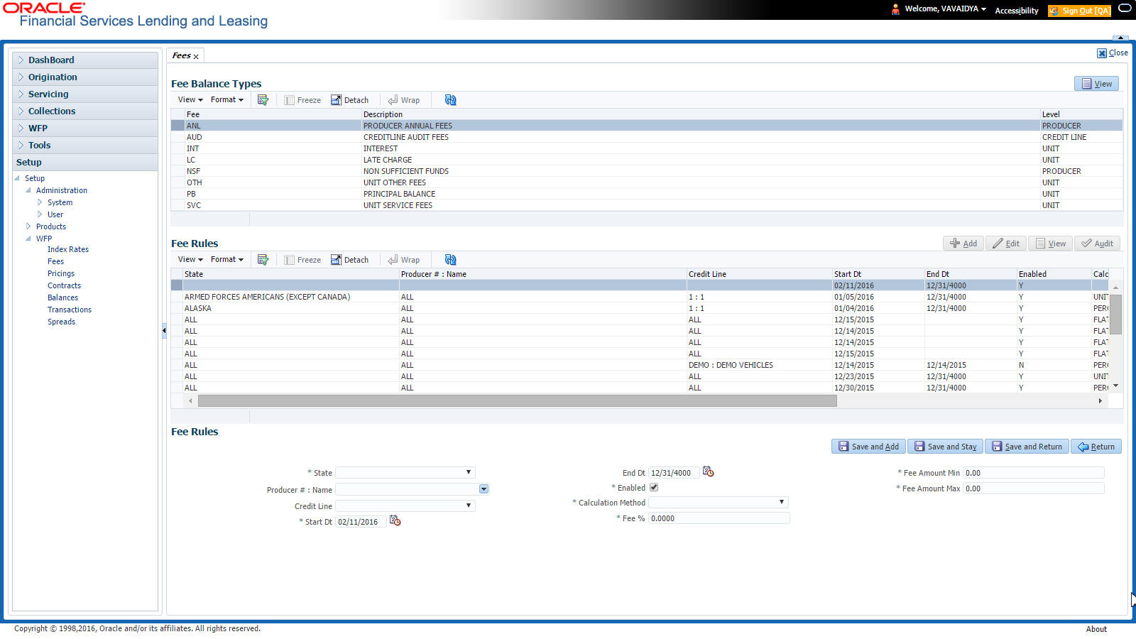 On the Oracle Financial Services Lending and Leasing home screen, click Setup > Setup > WFP > Fees.