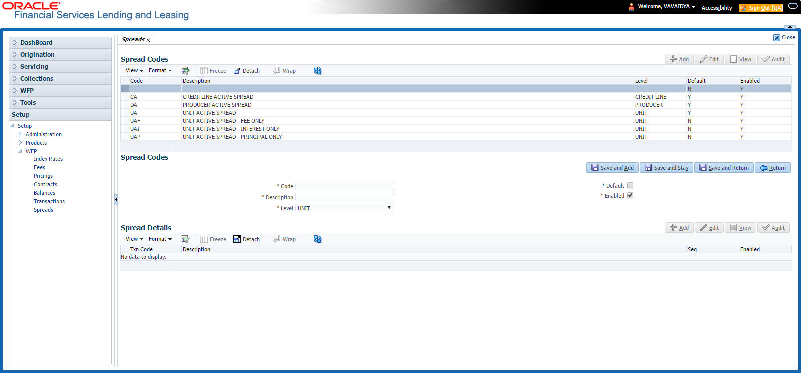 On the Oracle Financial Services Lending and Leasing home screen, click Setup > Setup > WFP > Spreads.