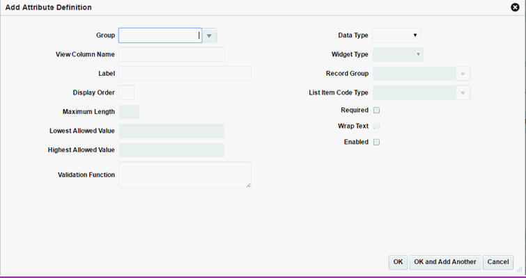In case you selected List of Values widget type, the Record Group field gets enabled. Use the LOV button to select one of the available record groups. Record groups are set up in the Record Groups Maintenance screen.