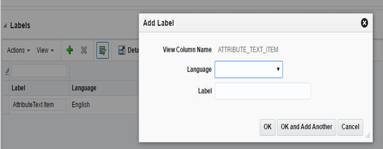 Under Label, enter relevant labels for the attributes. Click OK+Add Another to set up labels for other languages.