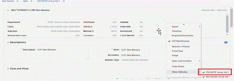 The following figure illustrates a CFAS user interface that can be accessed by clicking the ITM MSTR Group Set 1 option from the Other Attributes menu of the Item Master screen: