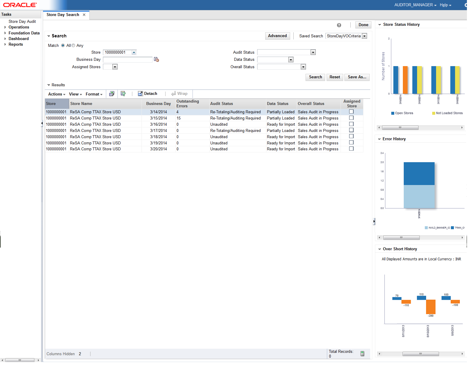 A view of all open transactional errors across his stores for the last seven days is available that helps him see error patterns and helps estimate his workload in fixing them. The auditor can then start fixing the errors by launching the respective ReSA screens directly from the links provided in the dashboard reports.