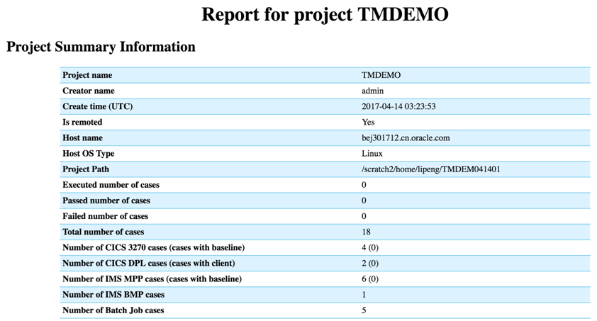 レポート ART Test Managerはプロジェクト情報のHTMLフォーマットへのエクスポートをサポートしており、印刷または共有にこのHTMLを使用できます。 レポートを生成するには、プロジェクト・ツリーを右クリックして「エクスポート」をクリックします。 プロジェクト・ノードを右クリックすると、選択したプロジェクト全体をエクスポートできます。 「グループ」ノードを右クリックすると、現在のプロジェクト、現在のグループ、および選択したグループのプラン/ケースをエクスポートできます。 「プラン」ノードを右クリックすると、現在のプロジェクト、現在のグループ、現在のプラン、および選択したプランのケースをエクスポートできます。 エクスポートされたレポート(.html)はブラウザで開くことができます。サンプルとして、レポートの一部を次に示します。 このレポートには次の情報が含まれています。 • プロジェクト・レベル情報 • プロジェクト名 • プロジェクト・クリエータ • プロジェクト作成時間(RP001よりも後に作成されたプロジェクトでのみ使用可能) • リモート・プロジェクト • ホスト名 • ホストOSタイプ • プロジェクト・パス • ケースの実行数 • 成功ケース数 • 失敗ケース数 • 合計ケース数 • CICS 3270ケース数(ベースラインを含むケース) • CICS DPLケース数(クライアントを含むケース) • IMS MPPケース数(ベースラインを含むケース) • IMS BMPケース数 • バッチ・ジョブ・ケース数 • 含有グループ情報 • グループ・レベル情報 • グループ名 • グループ・タイプ • APPDIR • DB情報 • キー・ディレクトリとその説明 • ユーザー・コメント • 実行前スクリプト • 実行後スクリプト • envコマンドの出力 • 実行済ケース数(下位プランのケースは除外) • 成功数(下位プランのケースは除外) • 失敗数(下位プランのケースは除外) • 含有プラン/ケース情報 • バッチ・グループの特殊情報 • DB/ファイル比較用のメインフレーム設定。 • プラン・レベル情報 • プラン名 • 実行前スクリプト • 実行後スクリプト • ユーザー・コメント • 実行ケース数 • 成功数 • 失敗数 • 含有ケース情報 • ケース・レベル情報 • ケース名 • ケース・タイプ • ケース・ステータス • ユーザー・コメント • 実行前スクリプト • 実行後スクリプト • 結果チェック・スクリプト • 3270ケース用の特殊情報(CICS 3270/IMS MPP) • ベースラインが提供されているかどうか • Tn3270cprフィルタ・ファイル/パターン・ファイル • dplケースの特殊情報 • Dplクライアント(ud32)が使用可能かどうか(ud32の内容を表示) • バッチ・ジョブの特殊情報 • IMS tuxconfig for DFSRRC00 • IMS BMPケースの特殊情報 • DFSRRC00パラメータ