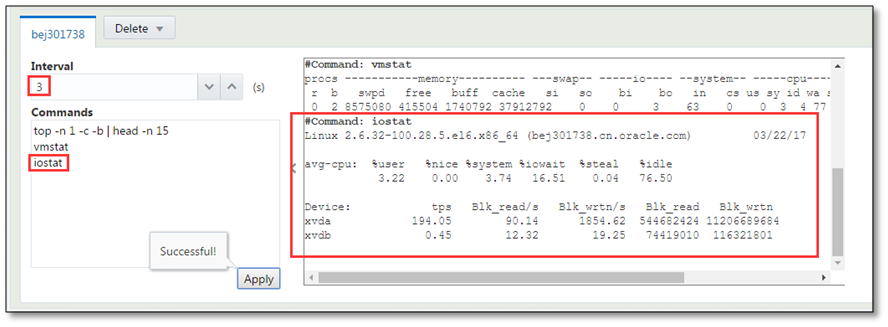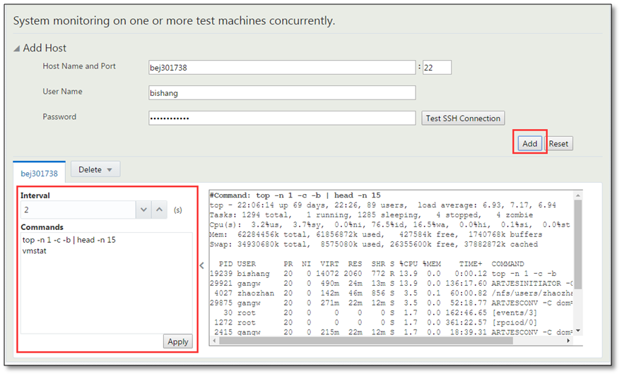 システムのモニタリング ART Test Managerエージェントで提供されているトランザクション、プログラム、またはジョブ実行のモニタリングに加えて、ART Test Managerはリモート・テスト・マシン向けのシステム・レベルのモニタリング機能も提供しています。システム・モニタリングでは、ユーザー指定のシステム・モニタリング・ツールを使用してテスト・マシンをモニタリングするためのリモート・インタフェースを提供しています。この機能にはウィンドウ右上のドロップダウン・メニューからアクセスできます。 システム・モニタリング・ビューにおける最初のステップでは、モニタリング対象のシステムを追加します。ホストを追加してモニタリングを開始するには、ホスト名、sshポート、ユーザー名、およびパスワードを指定し、「追加」ボタンをクリックします。追加されたシステムはそれぞれタブで表示されます。不要になったシステムは「削除」ドロップダウン・メニューで削除します。 特定のシステムに対応するタブをクリックすると、2ペインのビューが表示されます。左側の制御ペインでは、リフレッシュ間隔を指定し、モニタリング・コマンドを入力します。 たとえば、前述の図では間隔は2に設定されており、モニタリング用のコマンドとして「top」と「vmstat」が指定されています。制御ペインの右下隅の「適用」ボタンをクリックすると、右側の出力ペインにモニタリング・コマンドの出力が表示され、指定した間隔でリフレッシュされます。後述の図では間隔が3秒に変更されており、「iostat」コマンドが前の例の「top」と「vmstat」に追加されています。