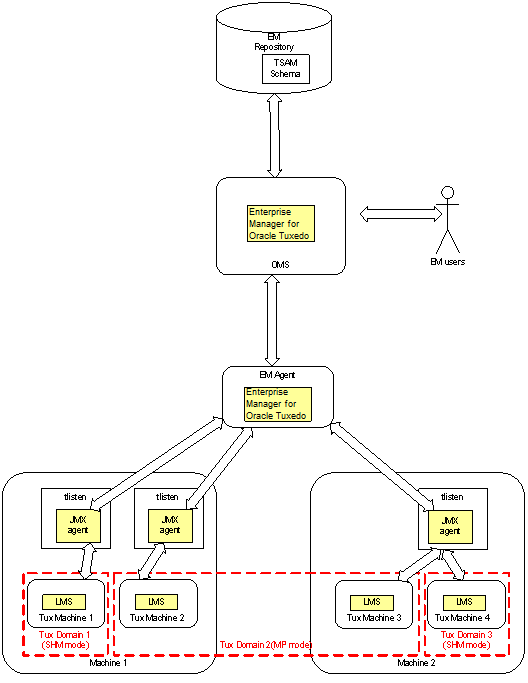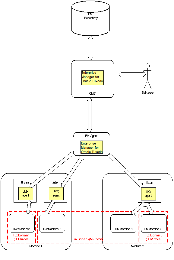 図2-1に、Enterprise Manager for Oracle Tuxedoの一般的なデプロイメント・シナリオを示します。