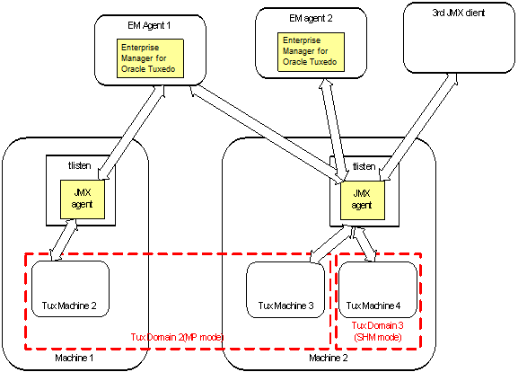 また、EnterpriseManagerエージェント1およびEnterpriseManagerエージェント2に、同時にTuxドメイン2とTuxドメイン3の両方をモニターさせることもできます。