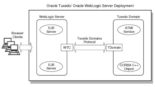 WebLogic Serverアプリケーション内のEJBアプリケーション・サーバーは、WTCゲートウェイおよびTDomainゲートウェイを使用してOracle Tuxedoアプリケーション内のサービスおよびCORBAオブジェクトを起動できます。