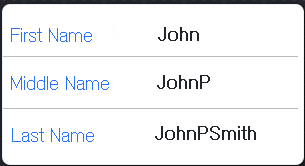 On mobile applications deployed to iOS simulators, text entered into one <amx:inputText> component field becomes attached to the beginning of the text entered in subsequent field when navigating from one field to another using a mouse. For example, on a page with First Name, Middle Name, and Last Name input text fields, if you enter John in the First Name field, then click the Middle Name field, and enter P, the text displays as JohnP. Likewise, when you click the Last Name field, and enter Smith, the text in that field displays as JohnPSmith, as shown in Figure A-1.
