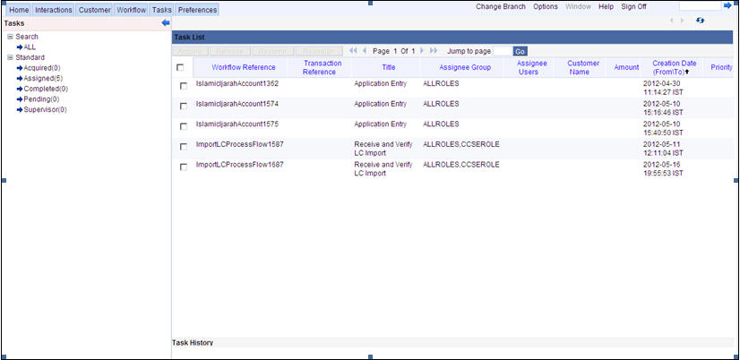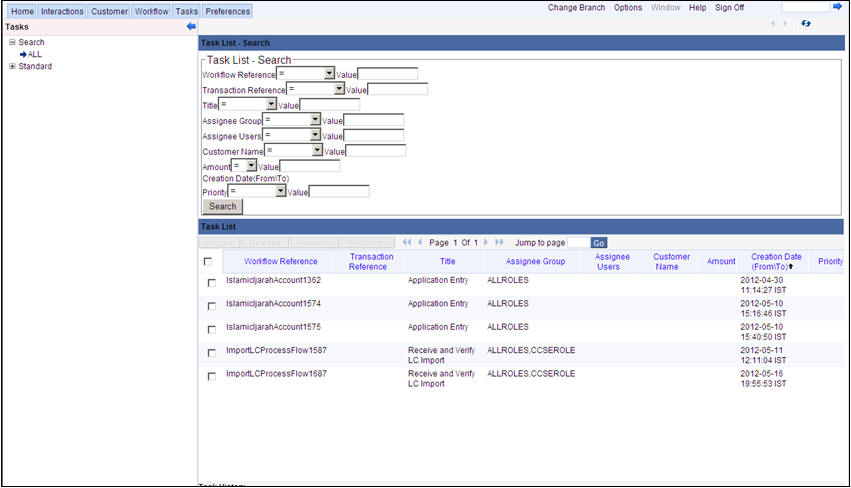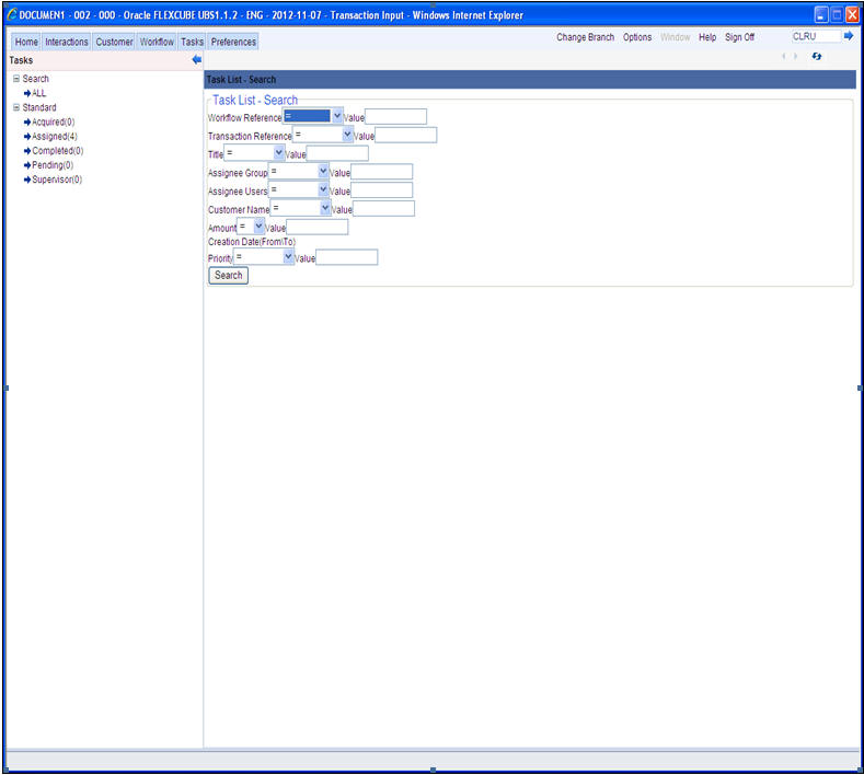 The page that is displayed on invoking the application is called as the ‘Landing Page’. As mentioned above, you can launch a search for a particular task on the basis of the fields displayed in the Task List pane under the ‘All’ sub-menu in the ‘Search’ main menu item. The fields under this sub-menu (All) are pre-defined in the system and represent all process flows. The search fields under the ‘All’ sub-menu are displayed as shown in the screen below: