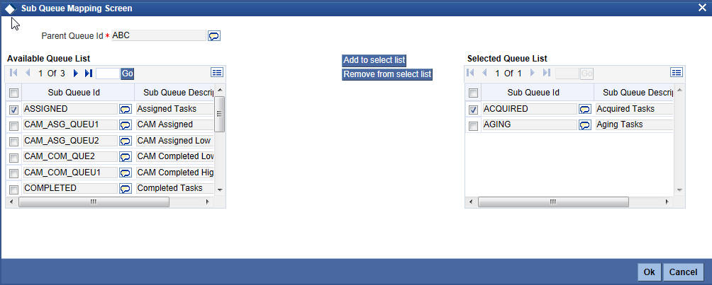 Available Queue List displays the sub queue IDs available for selection. You can add one or more sub queues to the Selected Queue List using ‘Add to select list’ button. Identify the required sub queues, check the adjoining check box and click ‘Add to select list’ button. The selected queues are added to Selected Queue List.