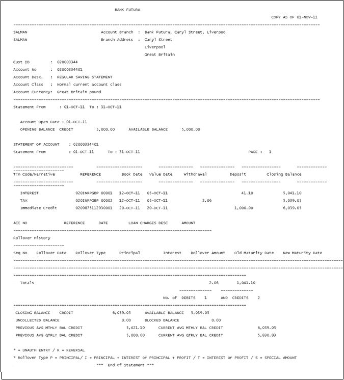 The statement displays the balance for CASA and TD accounts based on book dated or value dated balance. This will be parameterized at the bank level.