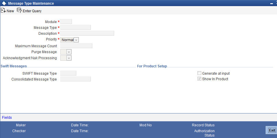 You can invoke the ‘Message Type Maintenance’ screen by typing ‘MSDMSTYM’ in the field at the top right corner of the Application tool bar and clicking the adjoining arrow button.