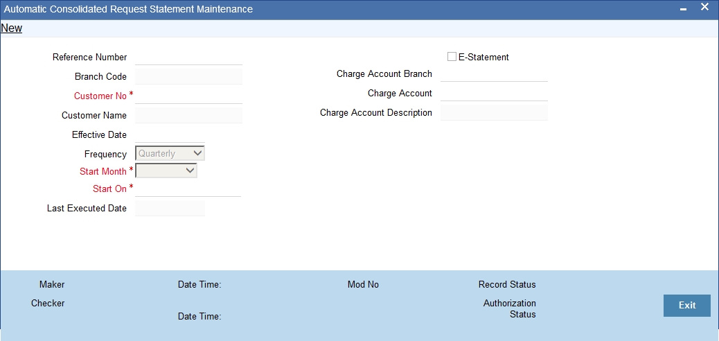 You can maintain statement requests of customers who would require consolidated statements on an automatic basis using the ‘Automatic Consolidated Request Statement Maintenance’ screen. You can invoke this screen by typing ‘STDACRST’ in the field at the top right corner of the Application tool bar and clicking on the adjoining arrow button.