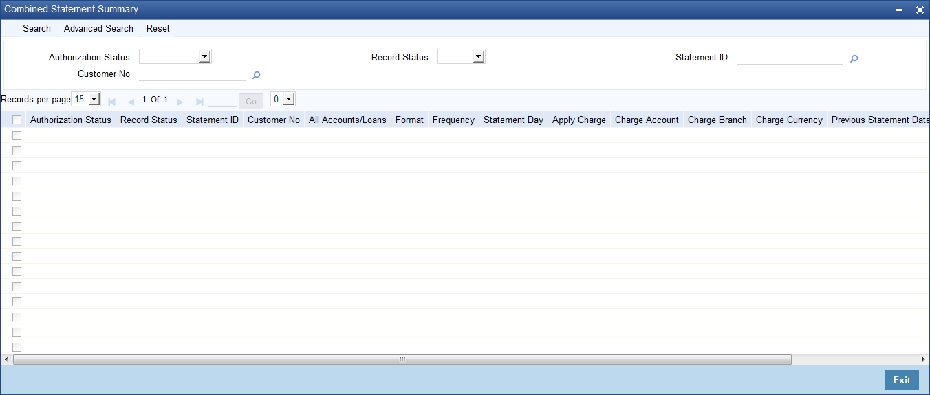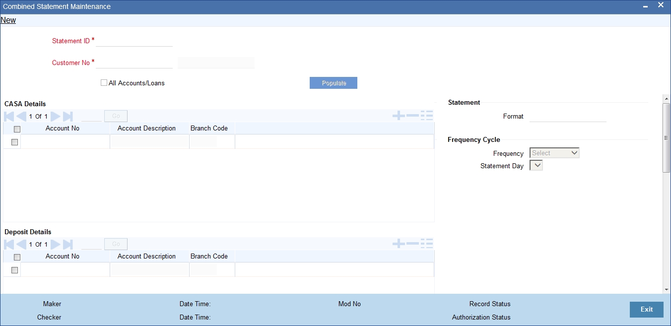 You can generate a combined statement for all accounts through the ‘Combined Statement Maintenance’ screen. To invoke this screen type ‘STDCDSTM’ in the field at the top right corner of the Application tool bar and click. the adjoining arrow button.